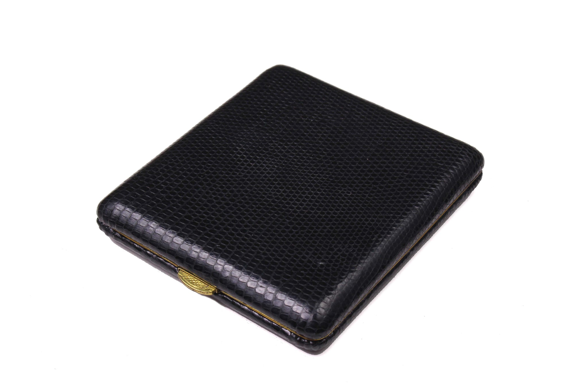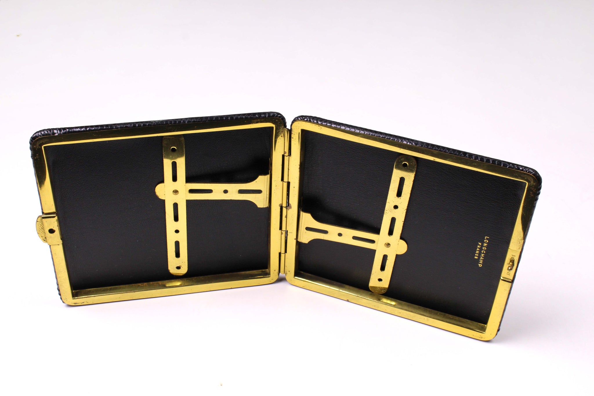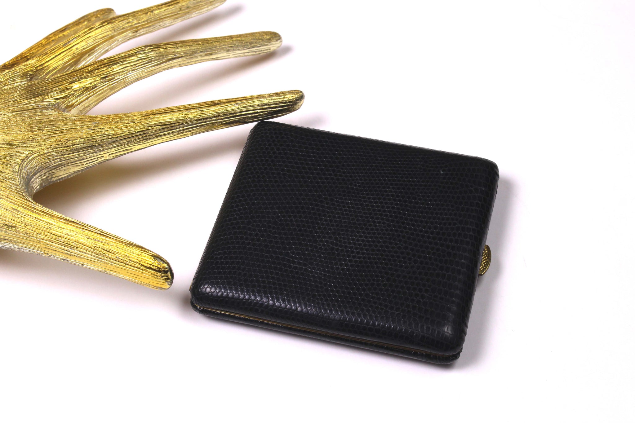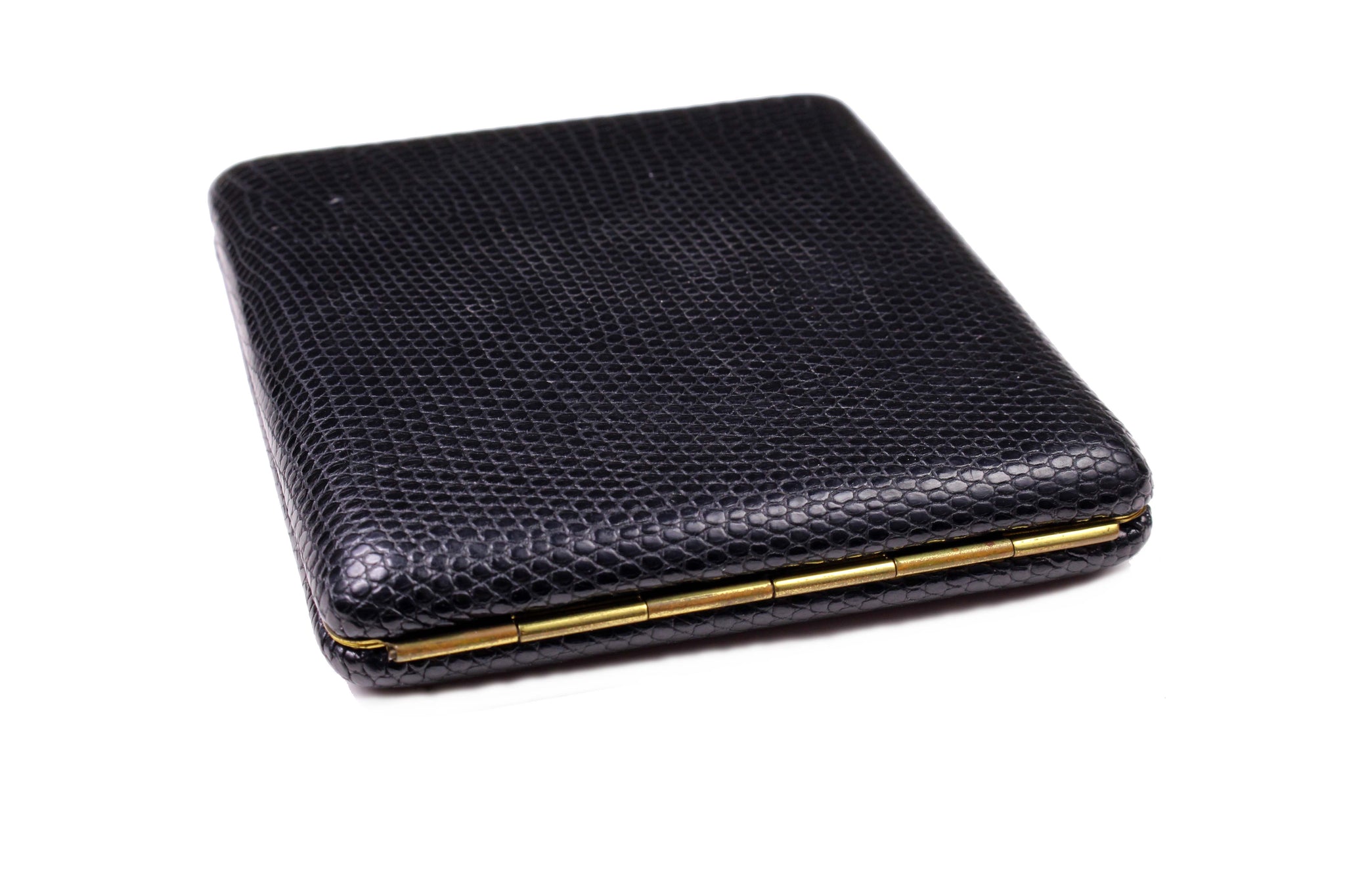 Lovely LONGCHAMP, France, vintage 1940's-50's black lizard skin cigarette case, rectangular frame and kiss clasp top closure. Interior lined wtih black leather.