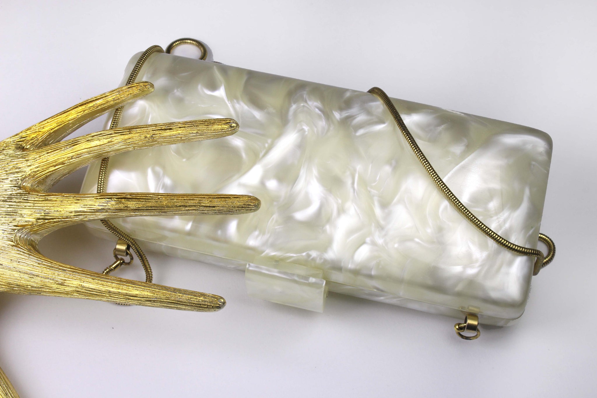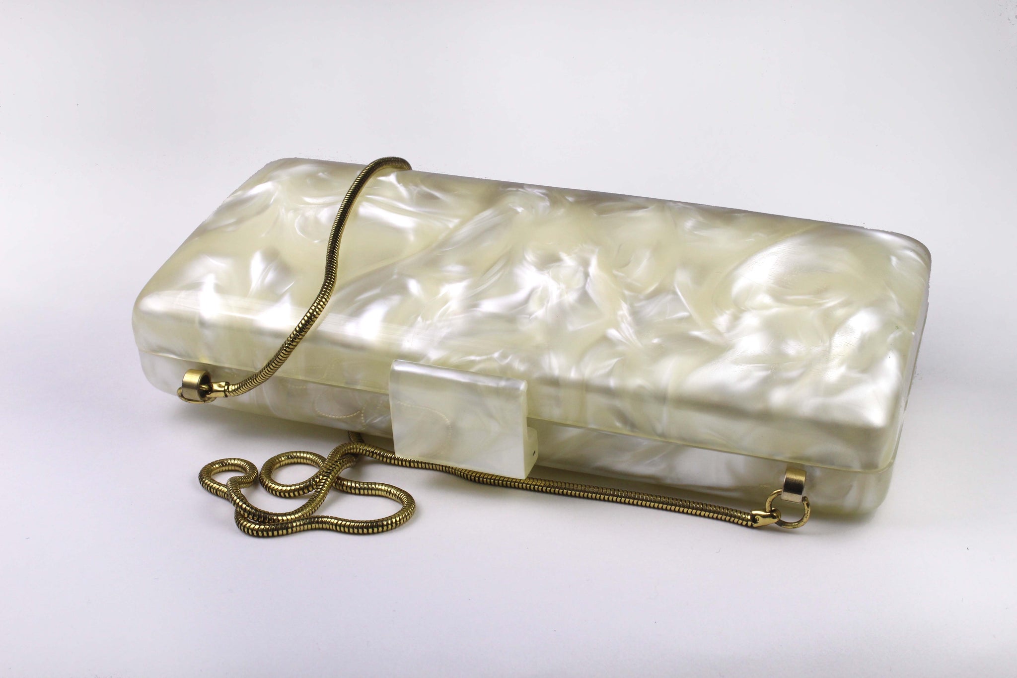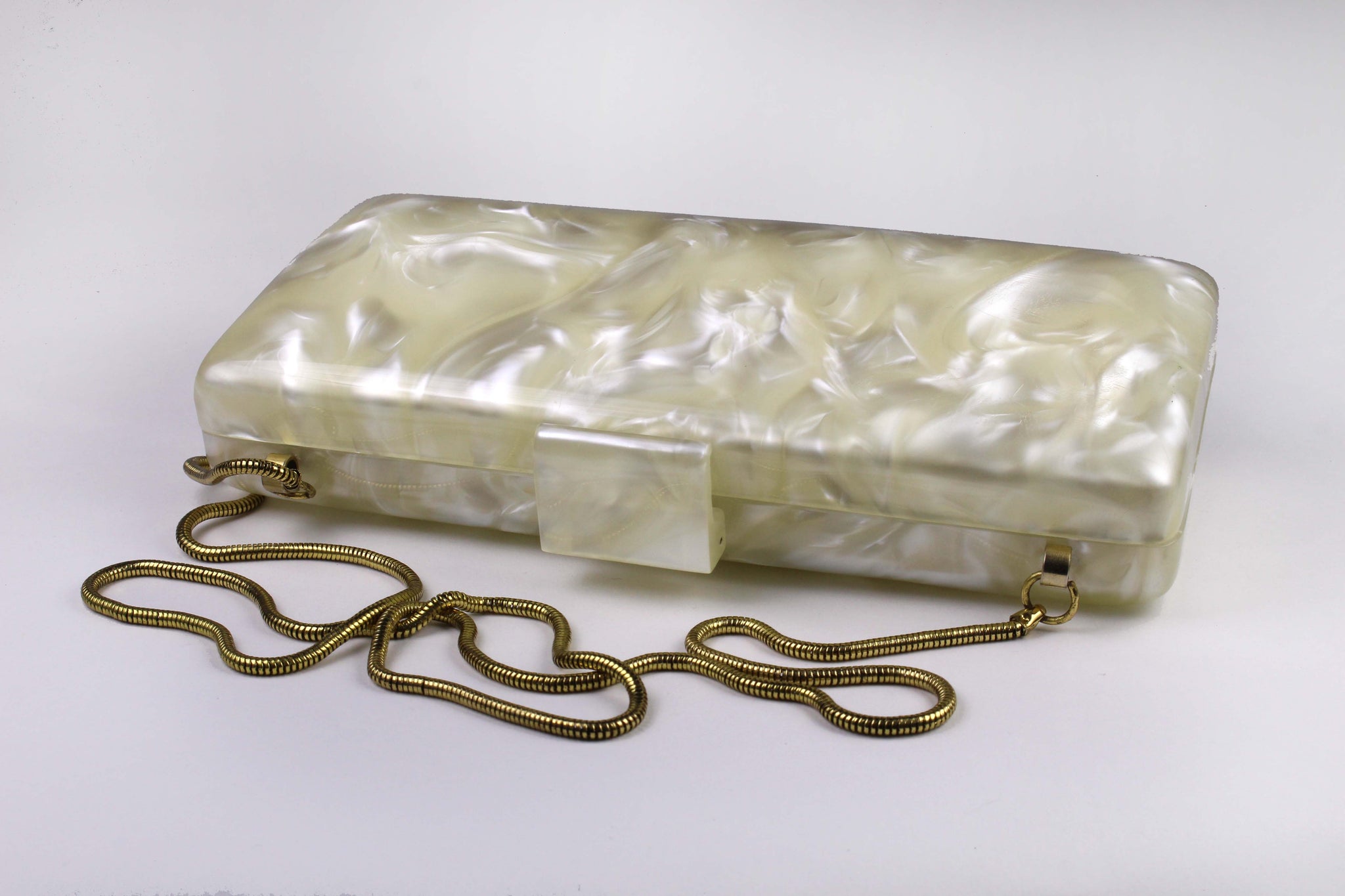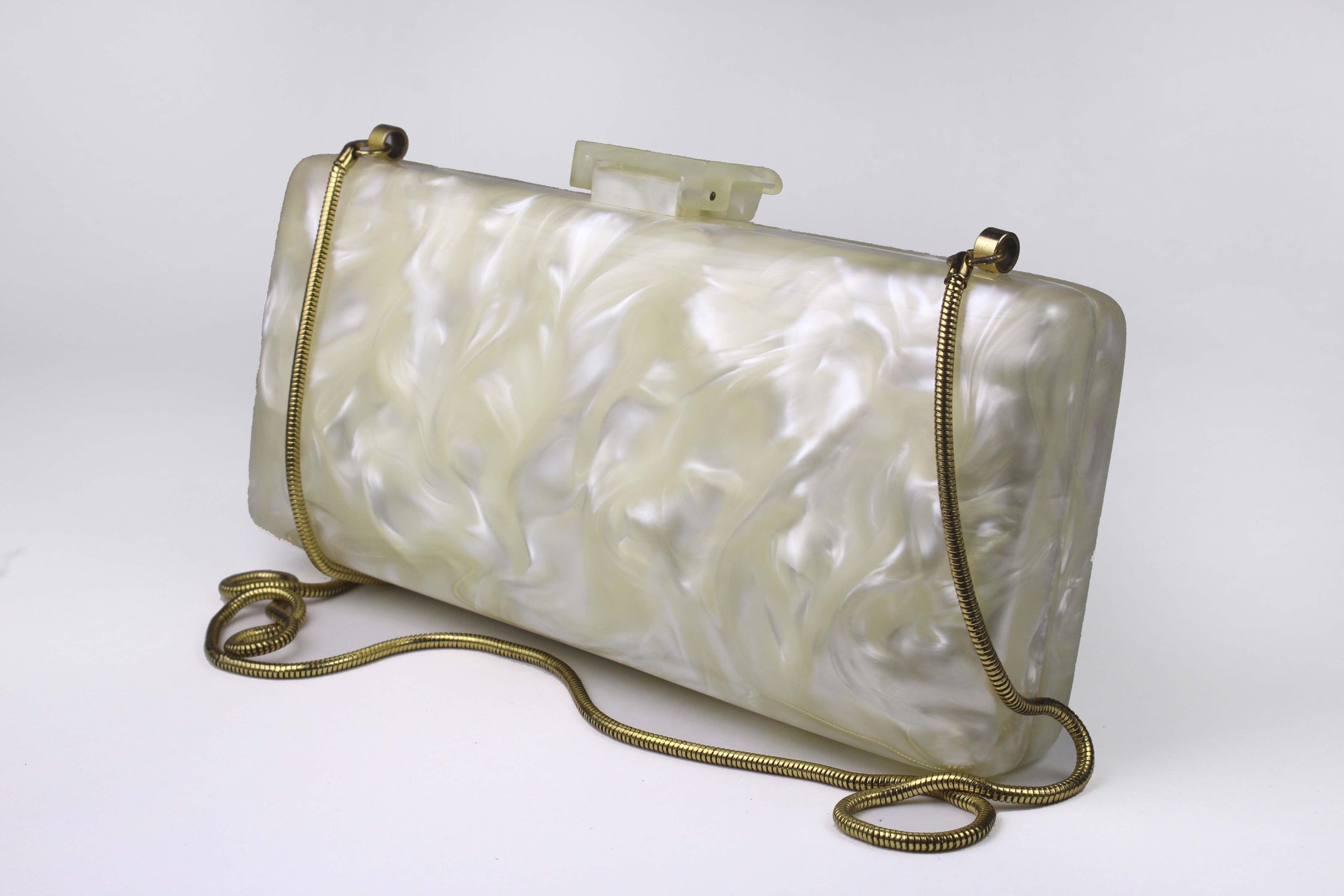 Vintage clutch purse, of marble white acrylic material. Rectangular shaped with metal frame with a nice push clasp. Interior with two compartments lined in white fabric. It has a gold shoulder chain strap. Excellent condition, the chain has some rust spots. Evening party clutch handbag with an elegant and timeless design.