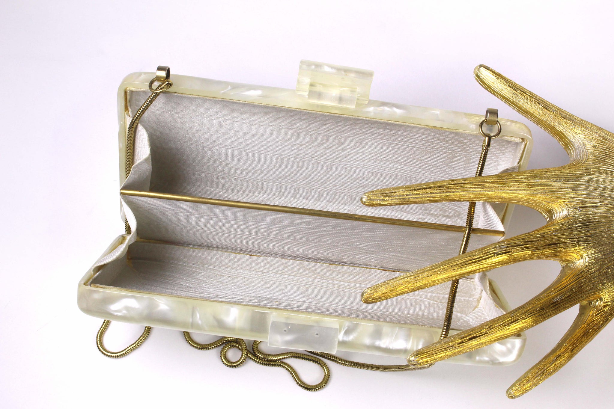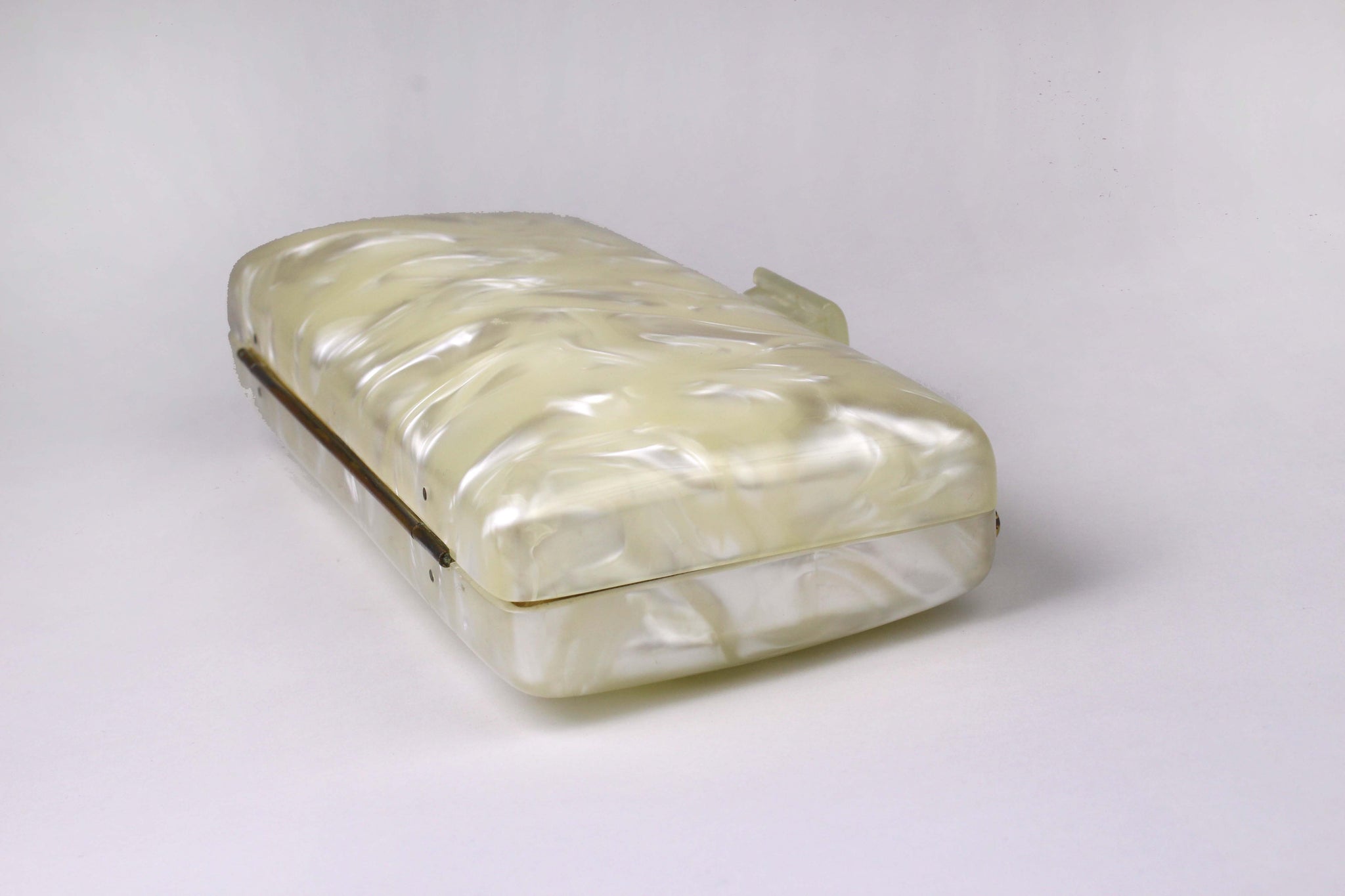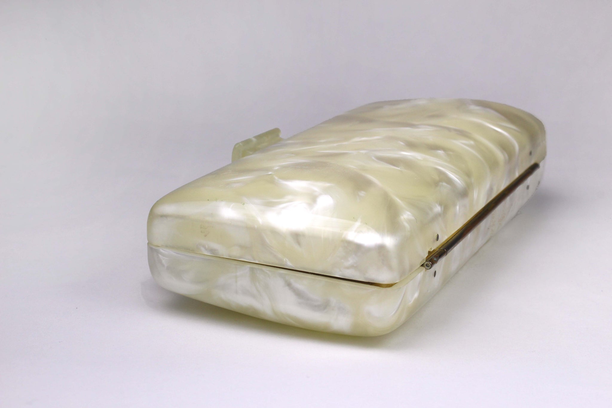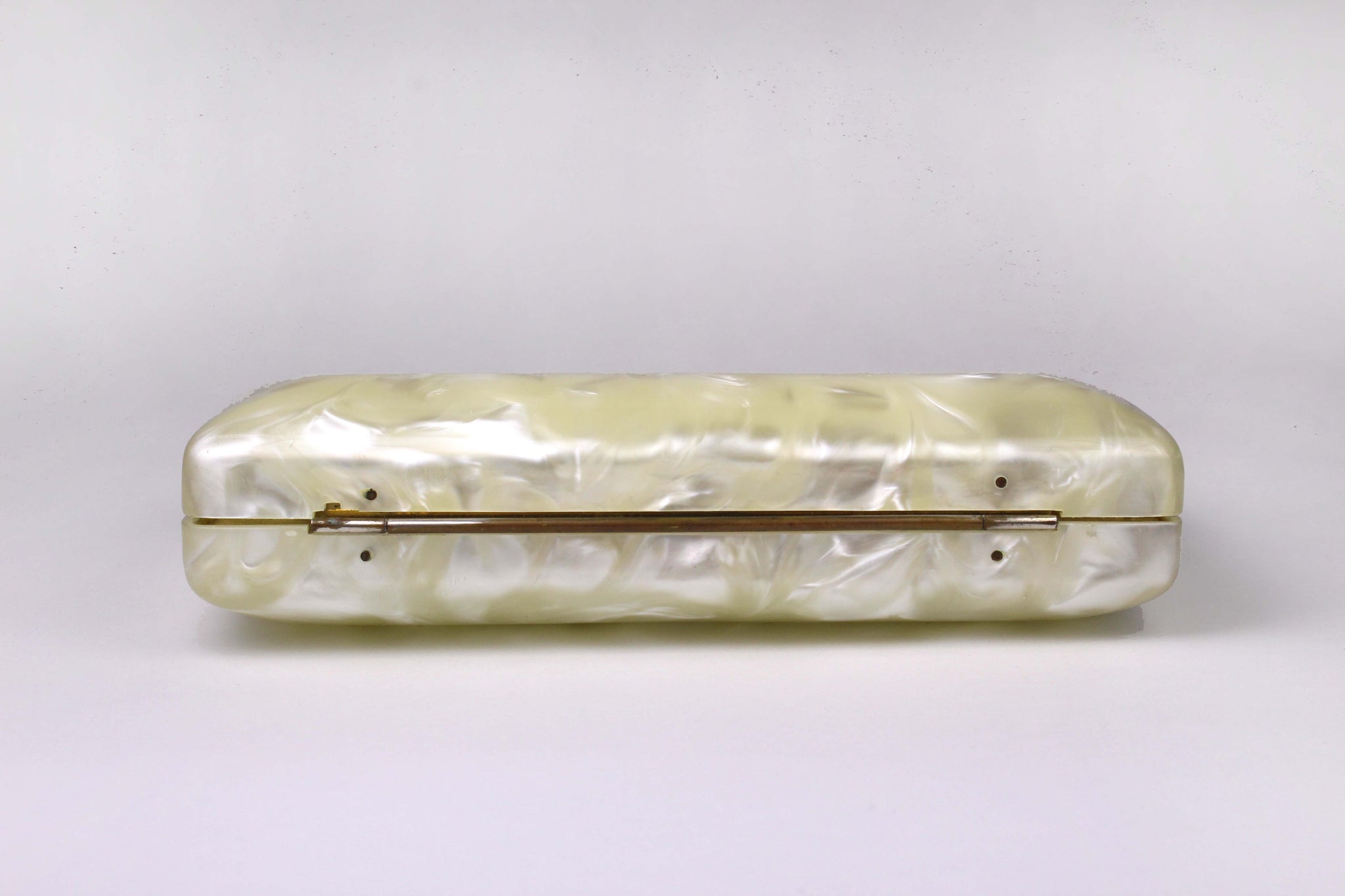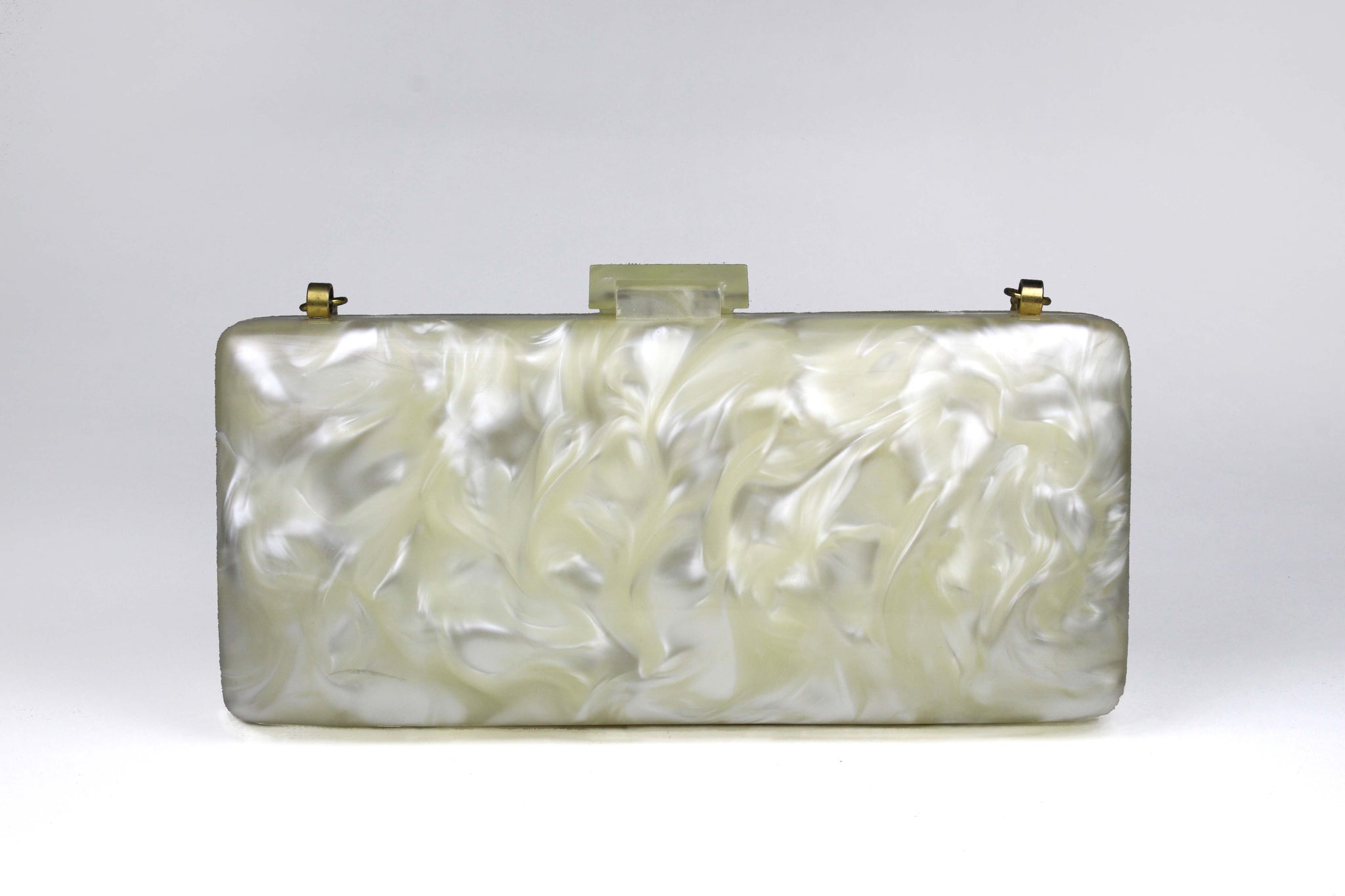 Vintage clutch purse, of marble white acrylic material. Rectangular shaped with metal frame with a nice push clasp. Interior with two compartments lined in white fabric. It has a gold shoulder chain strap. Excellent condition, the chain has some rust spots. Evening party clutch handbag with an elegant and timeless design.