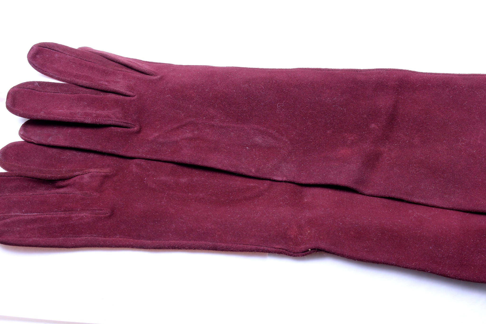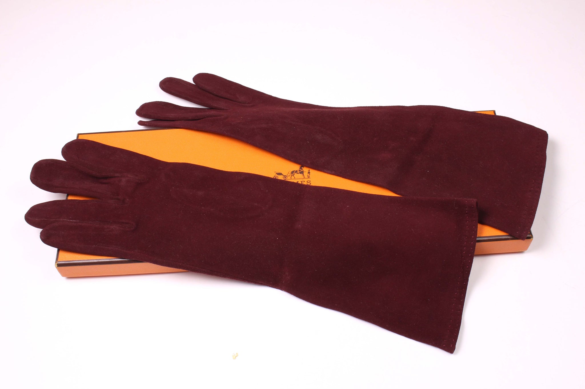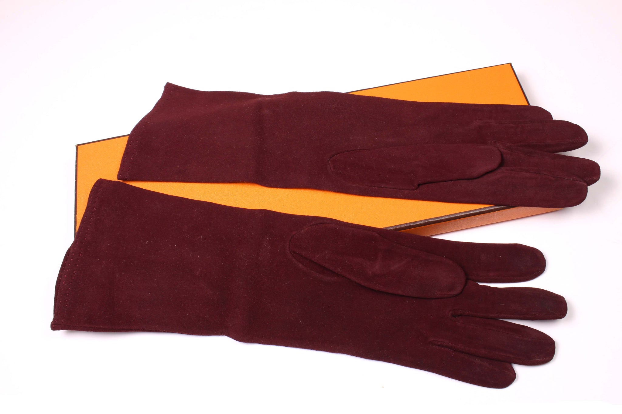 HERMÈS, made in France, vintage burgundy suede gloves, size: 7 1/2. Excellent condition, signs of use and some small, discreet stains, see images. Delivered in original Hermès box.