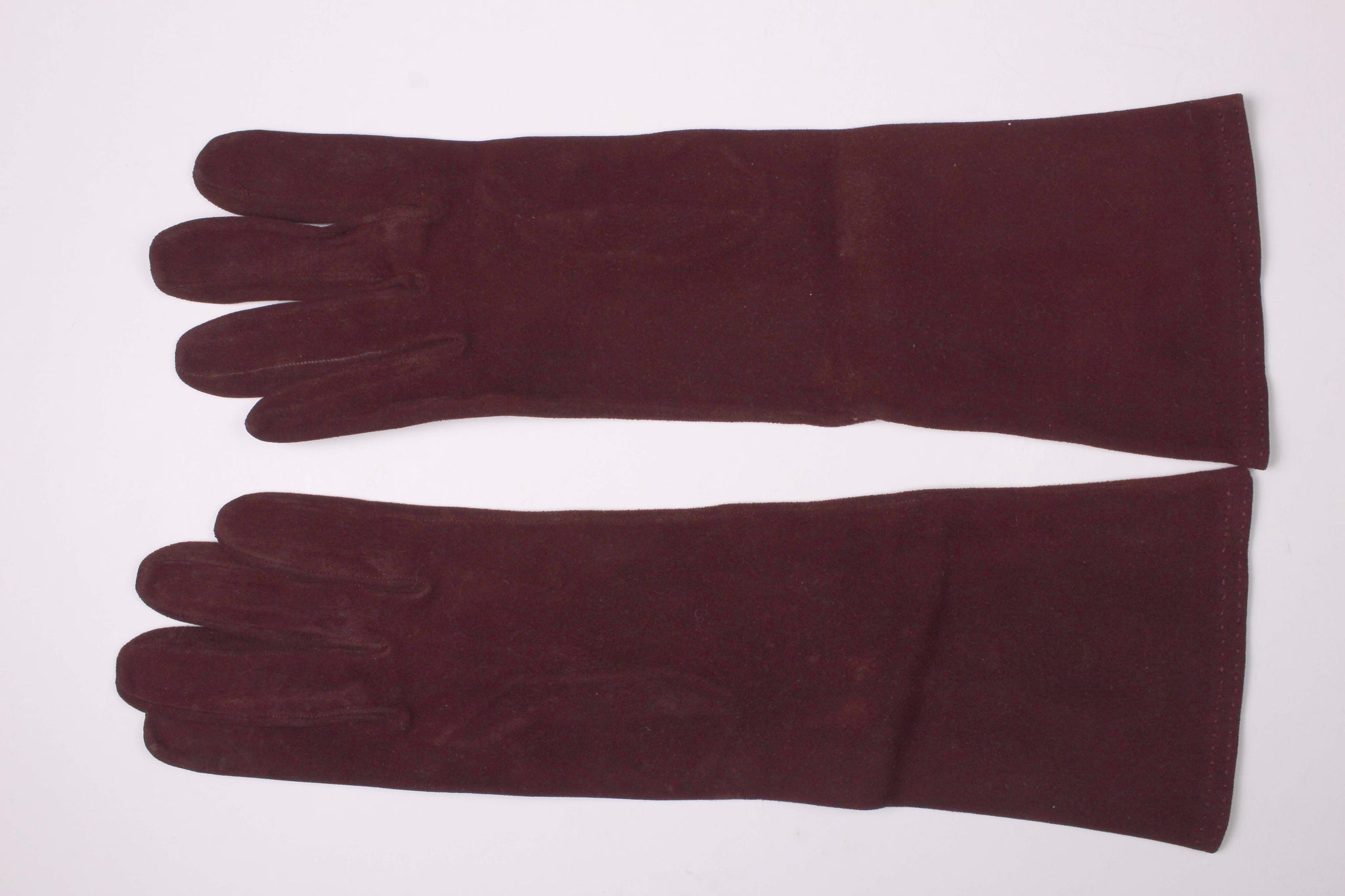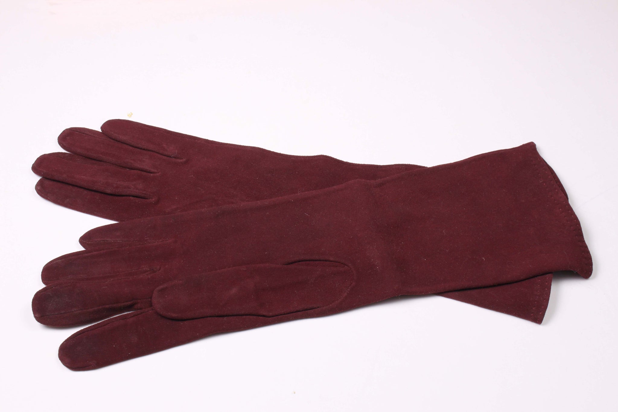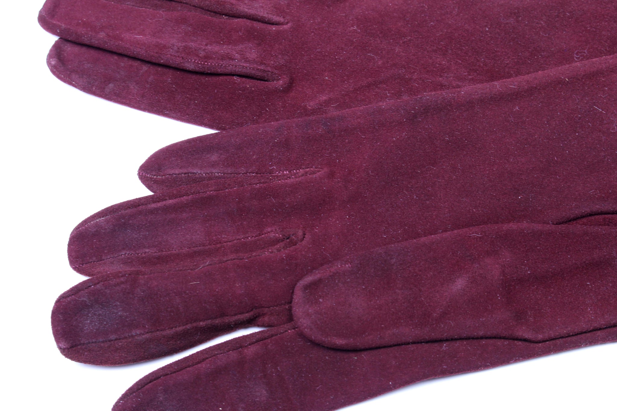 HERMÈS, made in France, vintage burgundy suede gloves, size: 7 1/2. Excellent condition, signs of use and some small, discreet stains, see images. Delivered in original Hermès box.