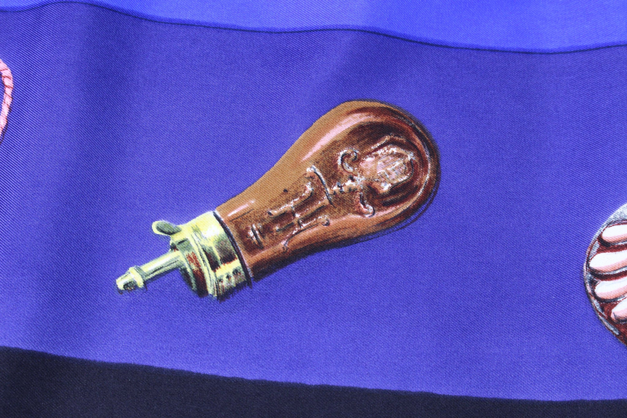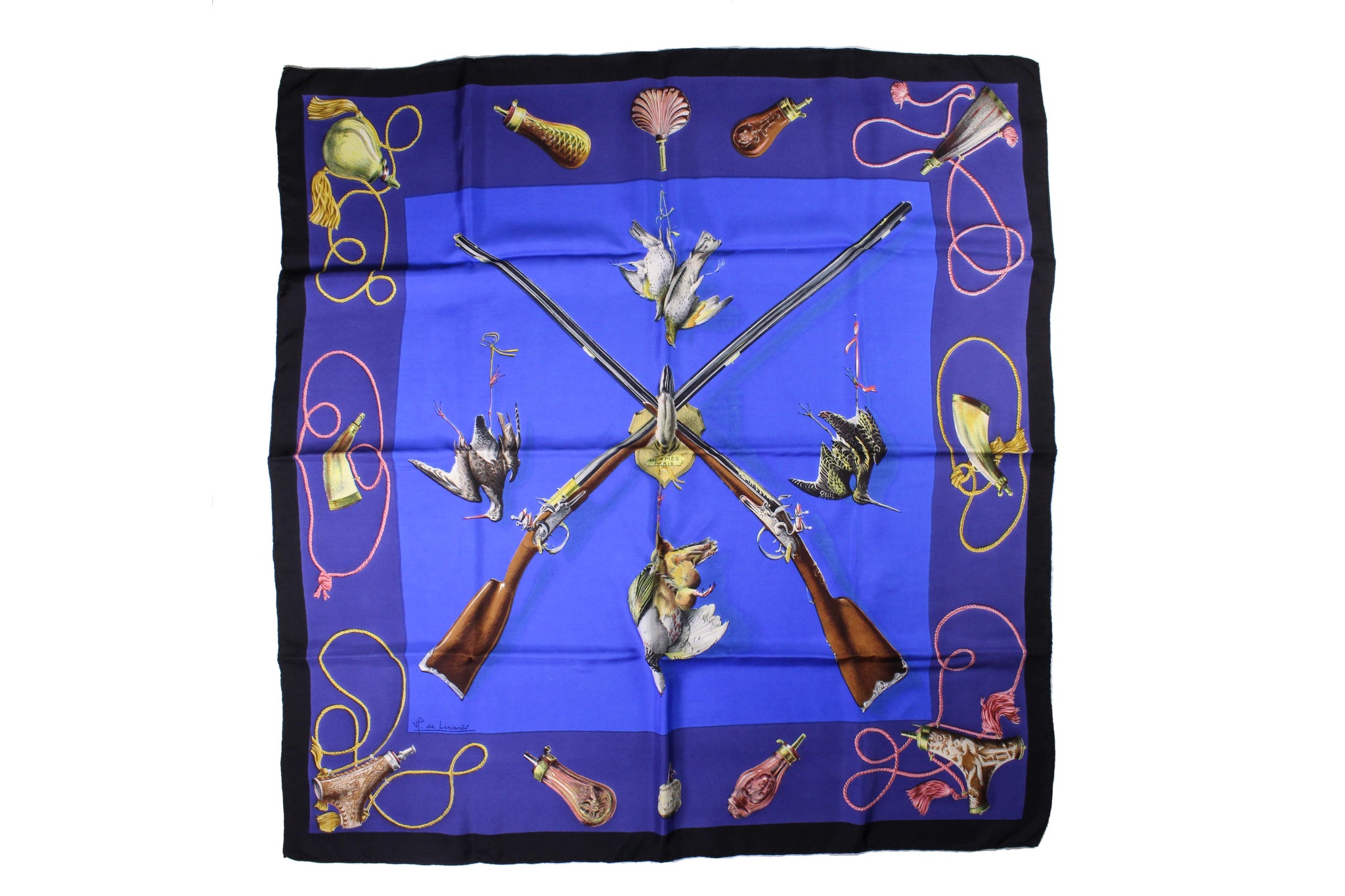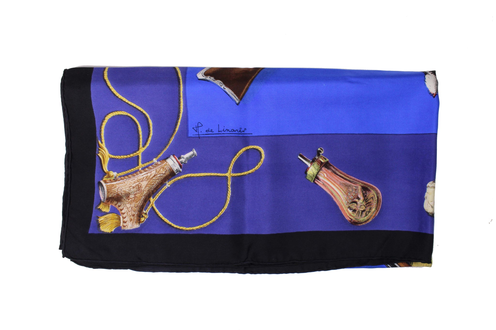 Vintage HERMÈS scarf “Les Fusils” by Henri de Linarès. 100% silk, made in France. Design from 1960. Predominant color; blue. The care tag not present. Clean by specialized professional. Excellent condition, with minor stains or imperfections, see last images. Delivered with original Hermès box.