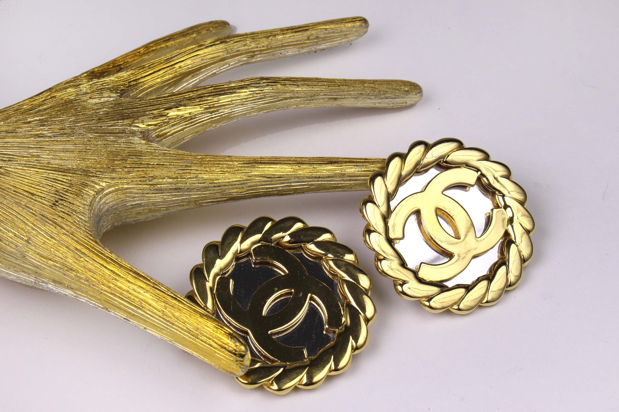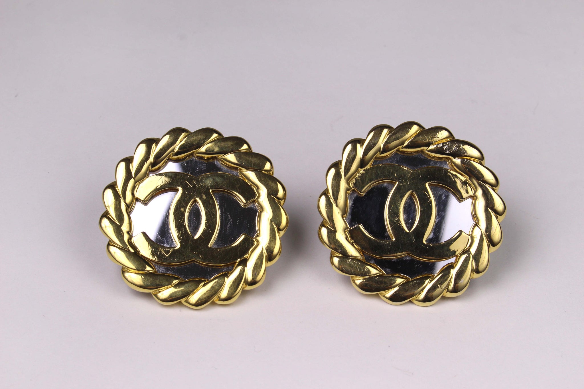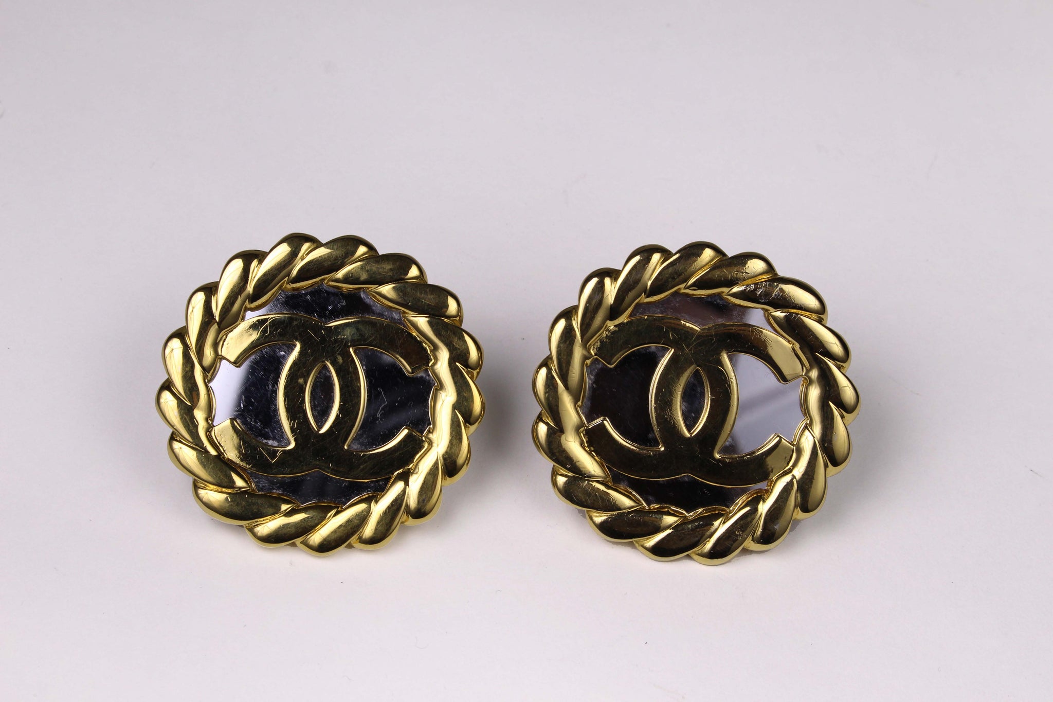 Vintage CHANEL, made in France, earrings from the Chanel Fall 1991 runway show. Giant circular clip-on earrings, perimeter with golden wheat and double CC logo in gold-tone metal on a mirrored background, silver-tone metal back. Signed on the back. Excellent condition, with light scratches on the front and some signs of wear on the back. Delivered in original Chanel box, with some wear on the cardboard.