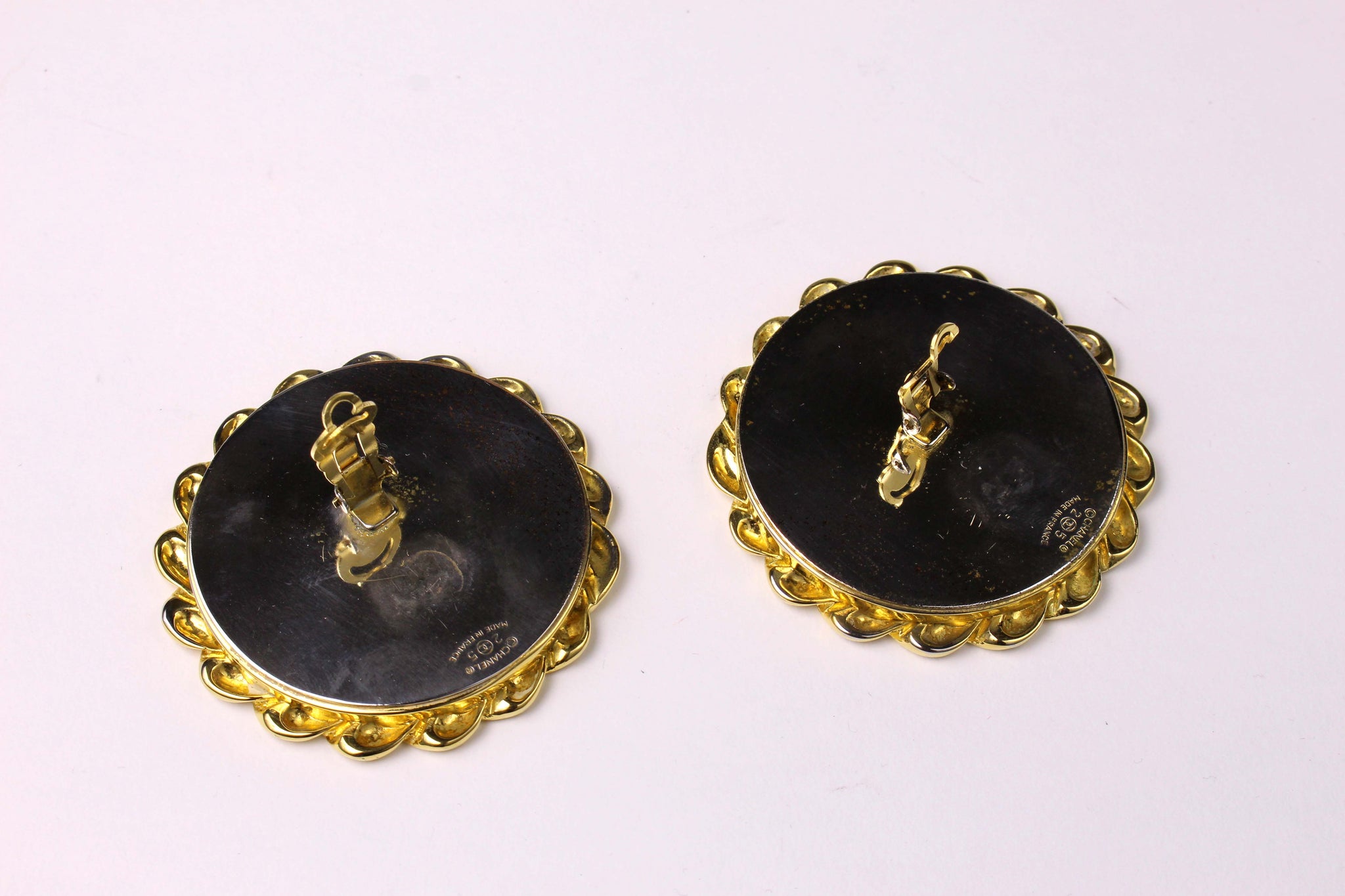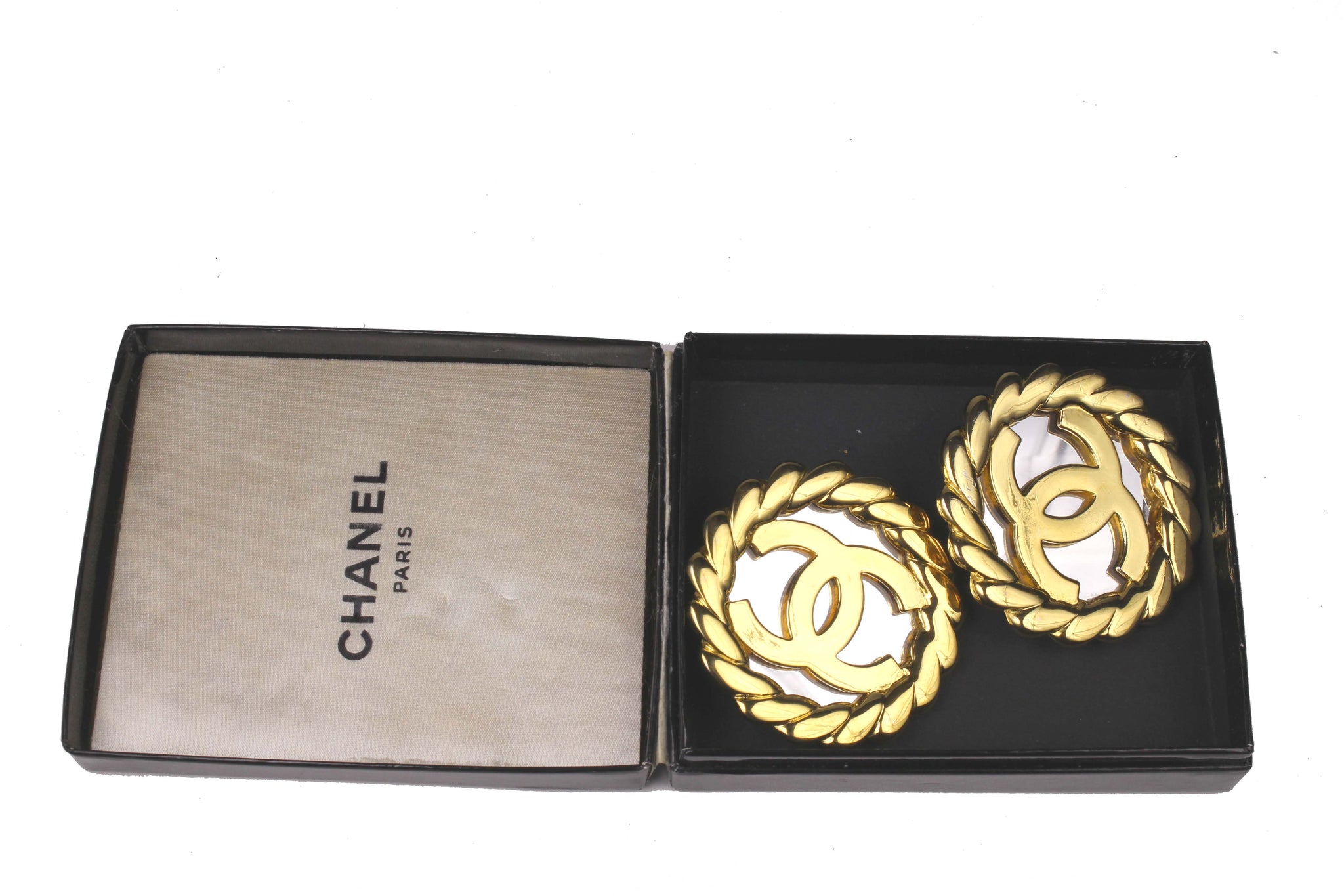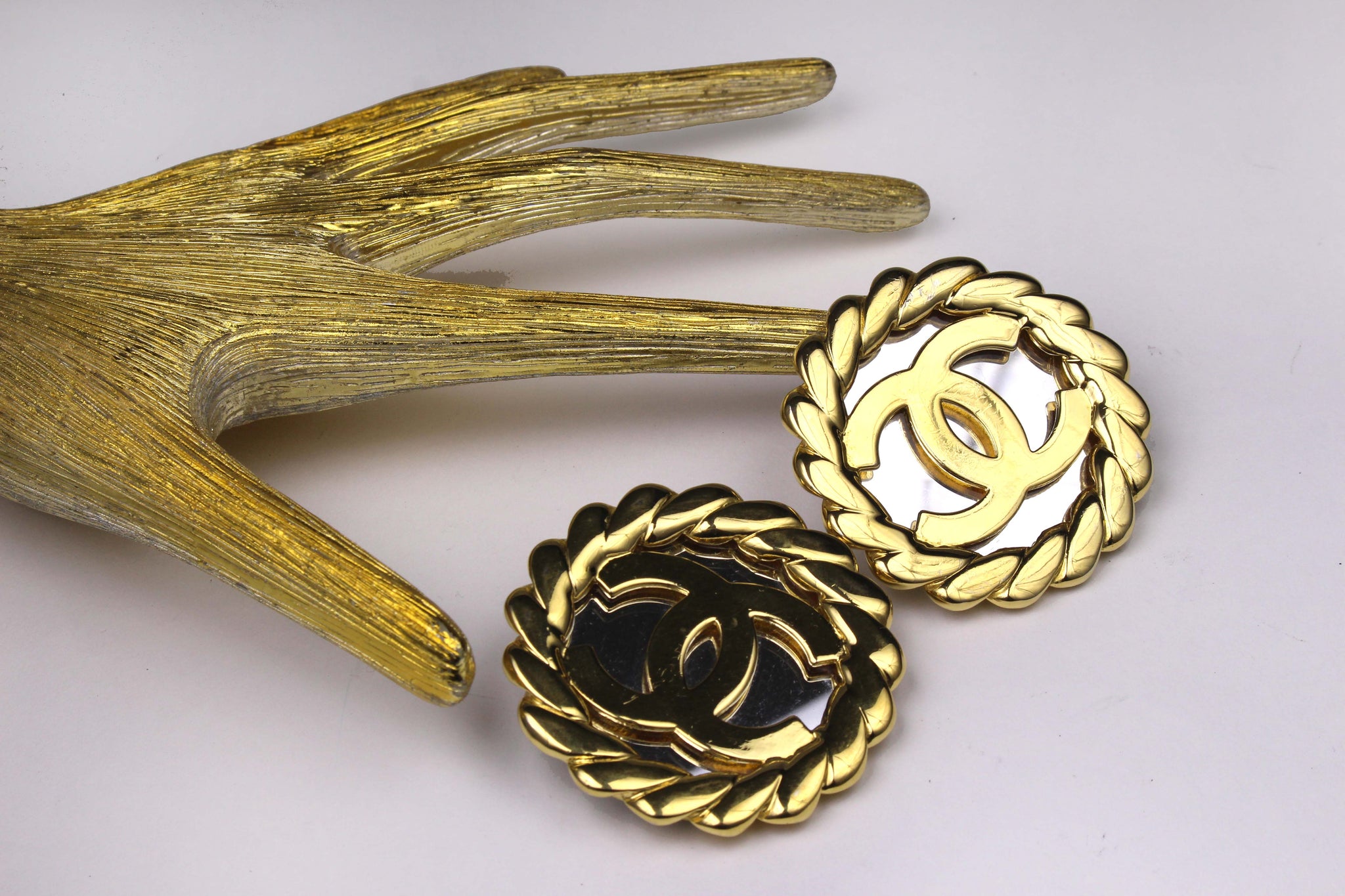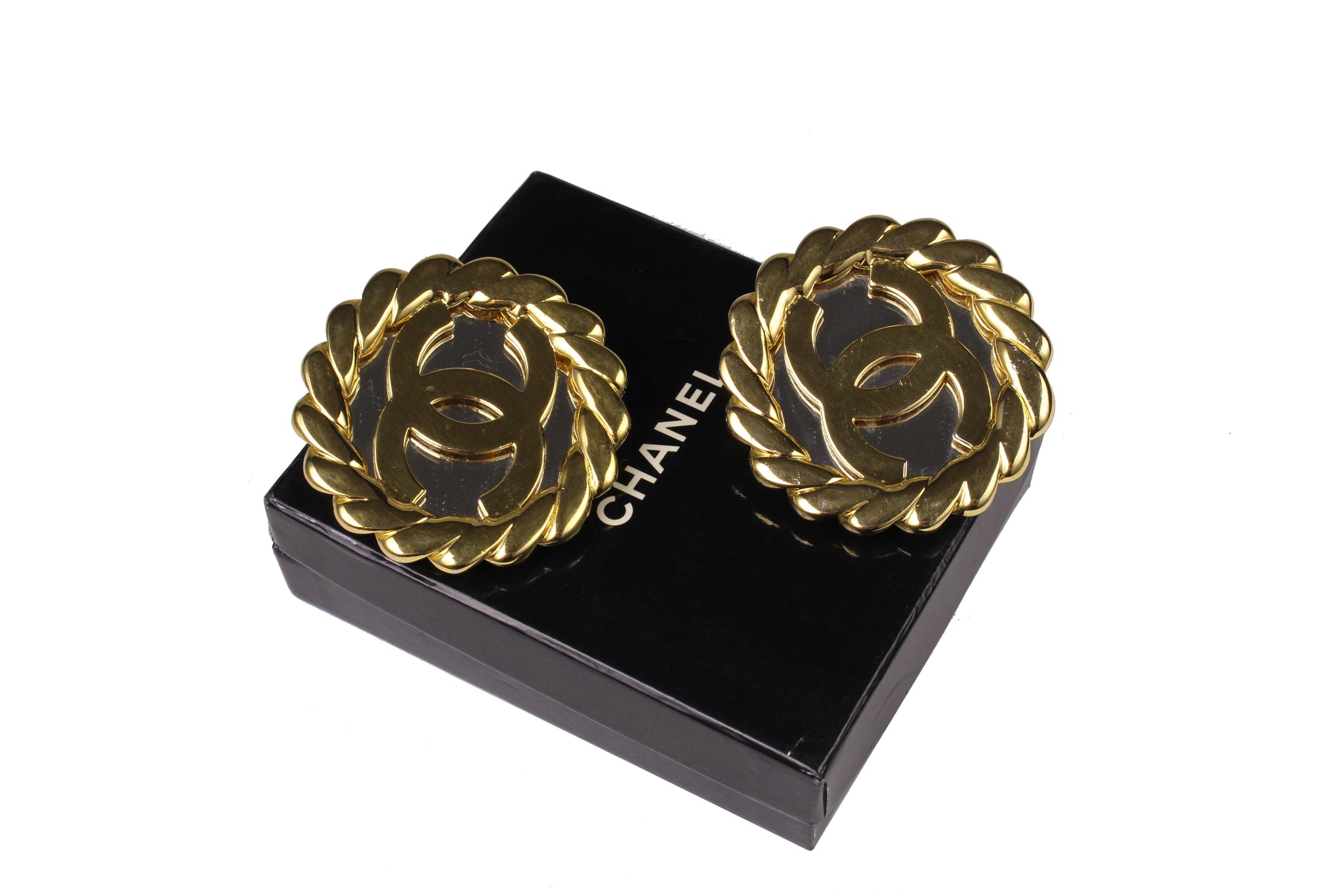 Vintage CHANEL, made in France, earrings from the Chanel Fall 1991 runway show. Giant circular clip-on earrings, perimeter with golden wheat and double CC logo in gold-tone metal on a mirrored background, silver-tone metal back. Signed on the back. Excellent condition, with light scratches on the front and some signs of wear on the back. Delivered in original Chanel box, with some wear on the cardboard.