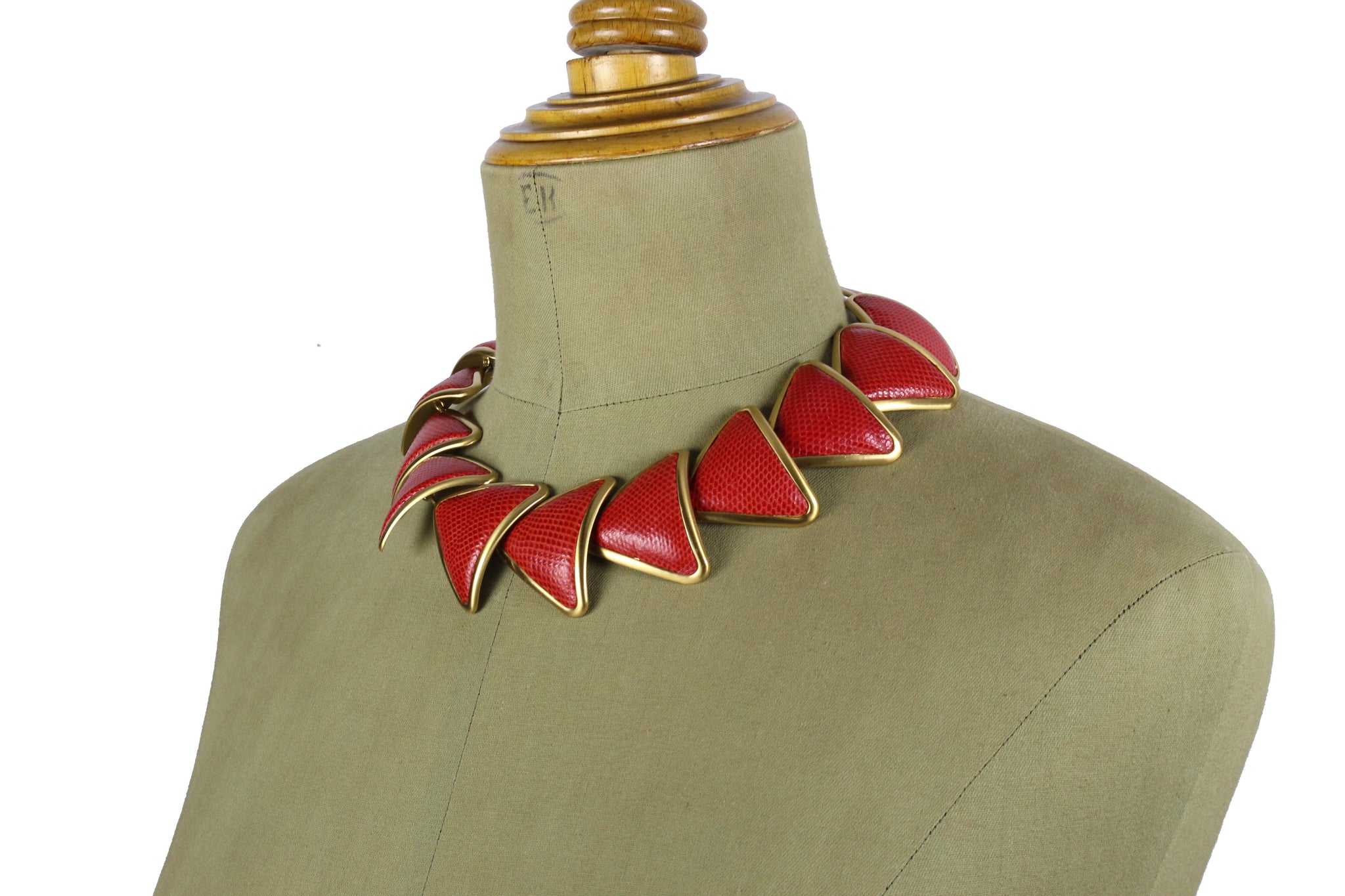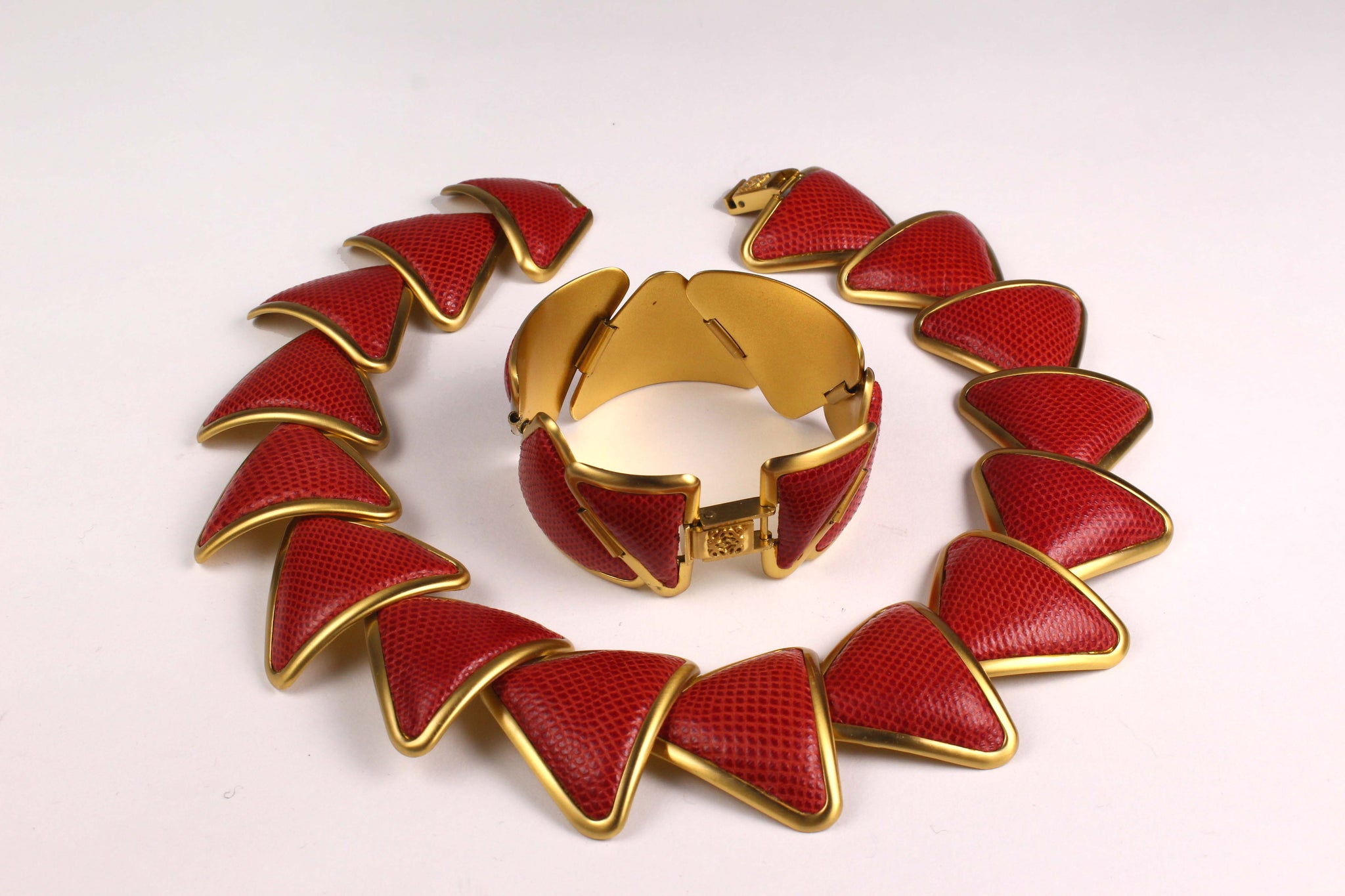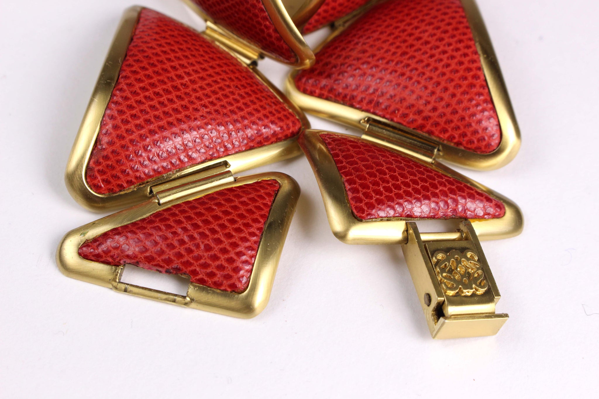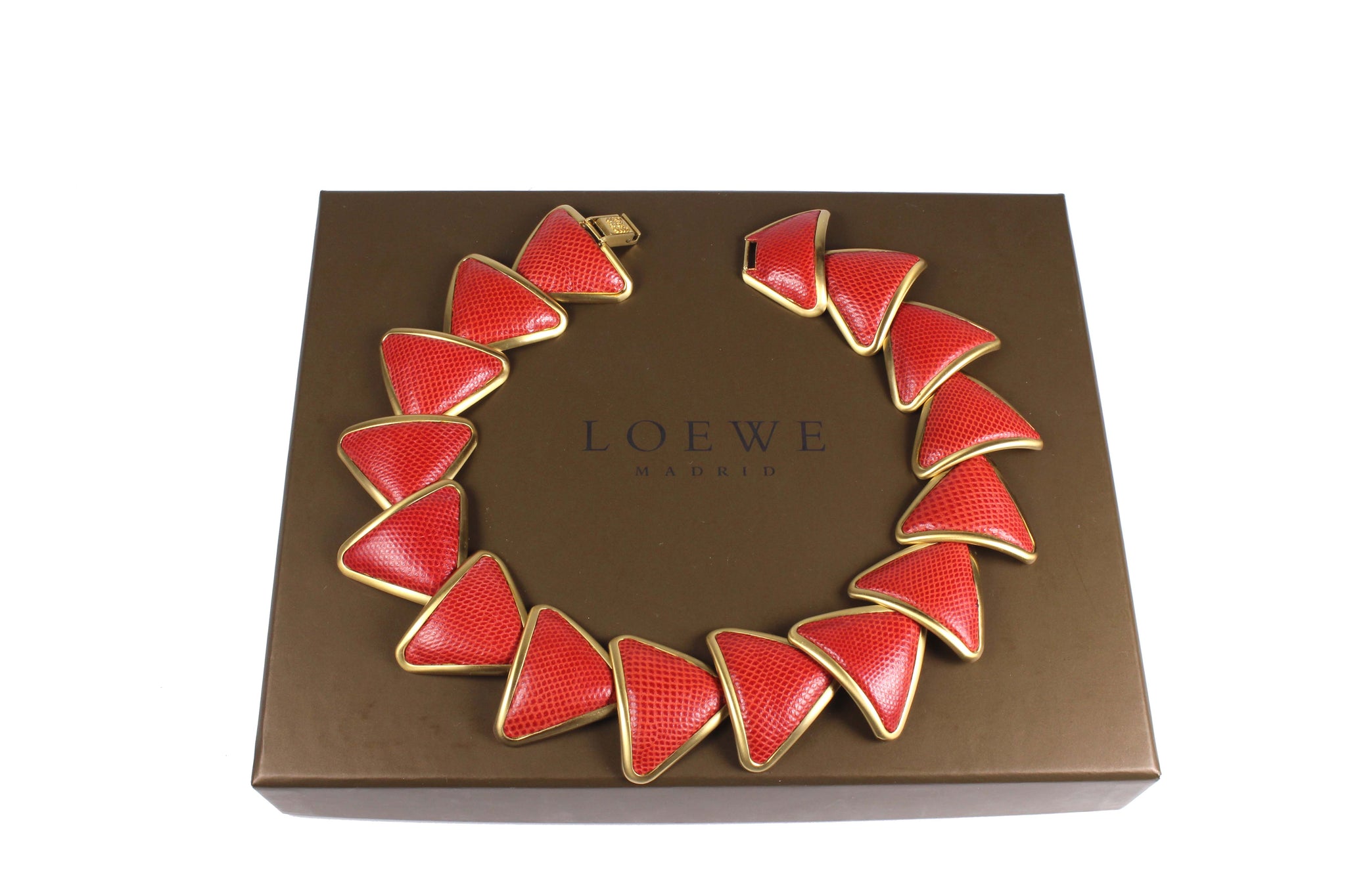 LOEWE, made in Spain, 2000's vintage necklace and bracelet set. Gold-tone metal triangle links covered in genuine red lizard skin, sliding drawer clasp, signed. Excellent condition, some small stains, see last image. Delivered in original Loewe box.