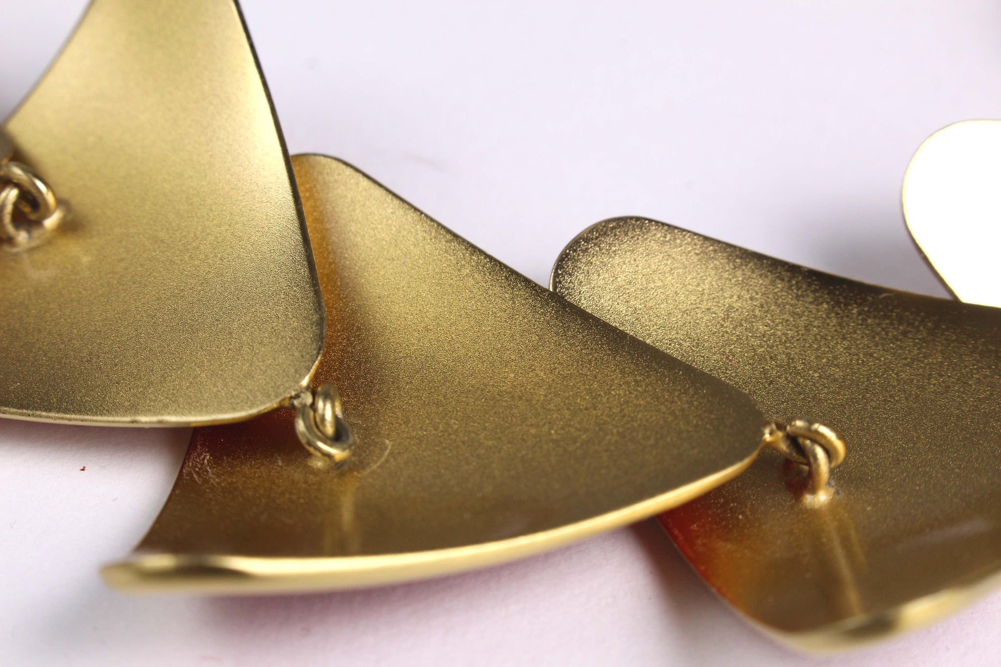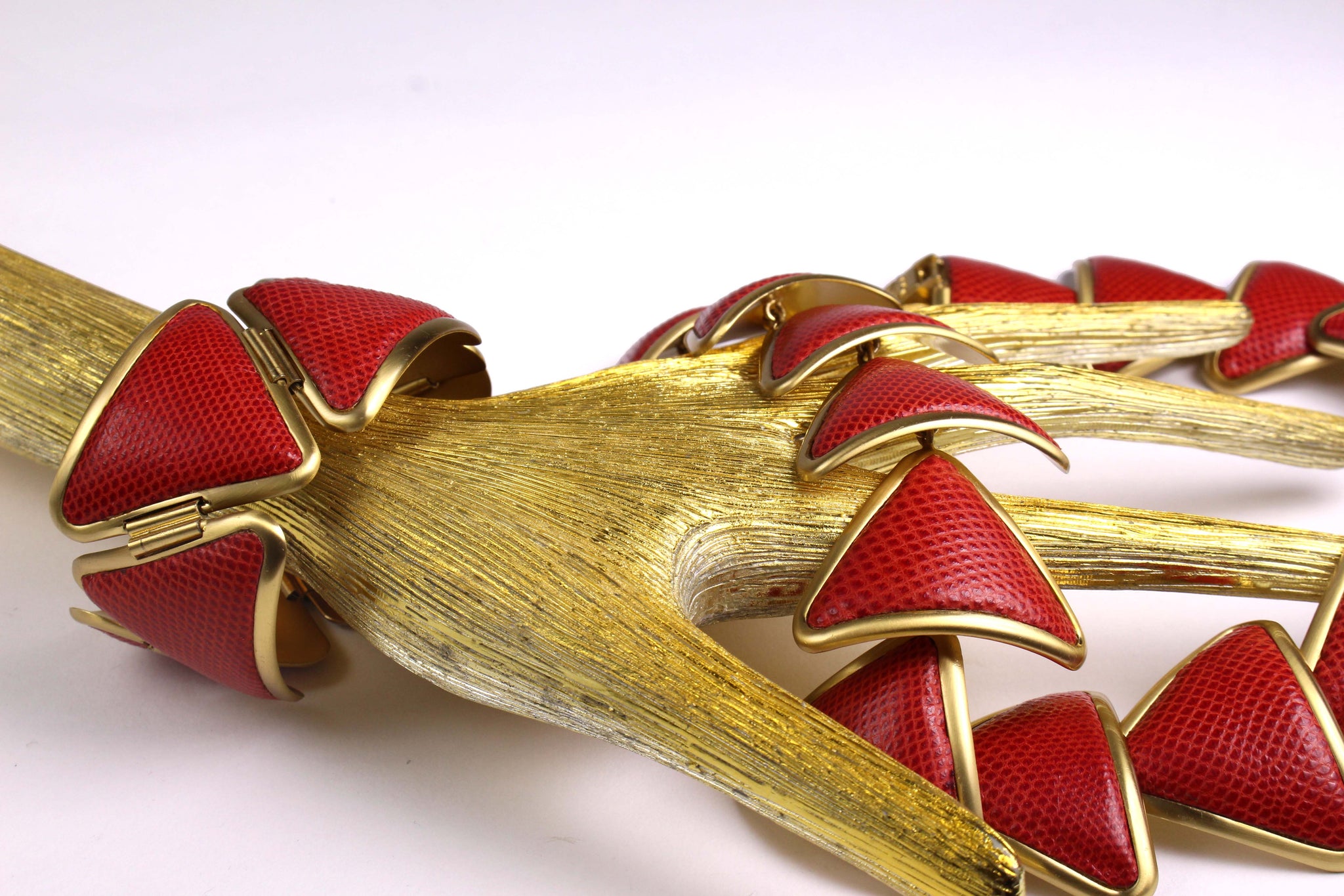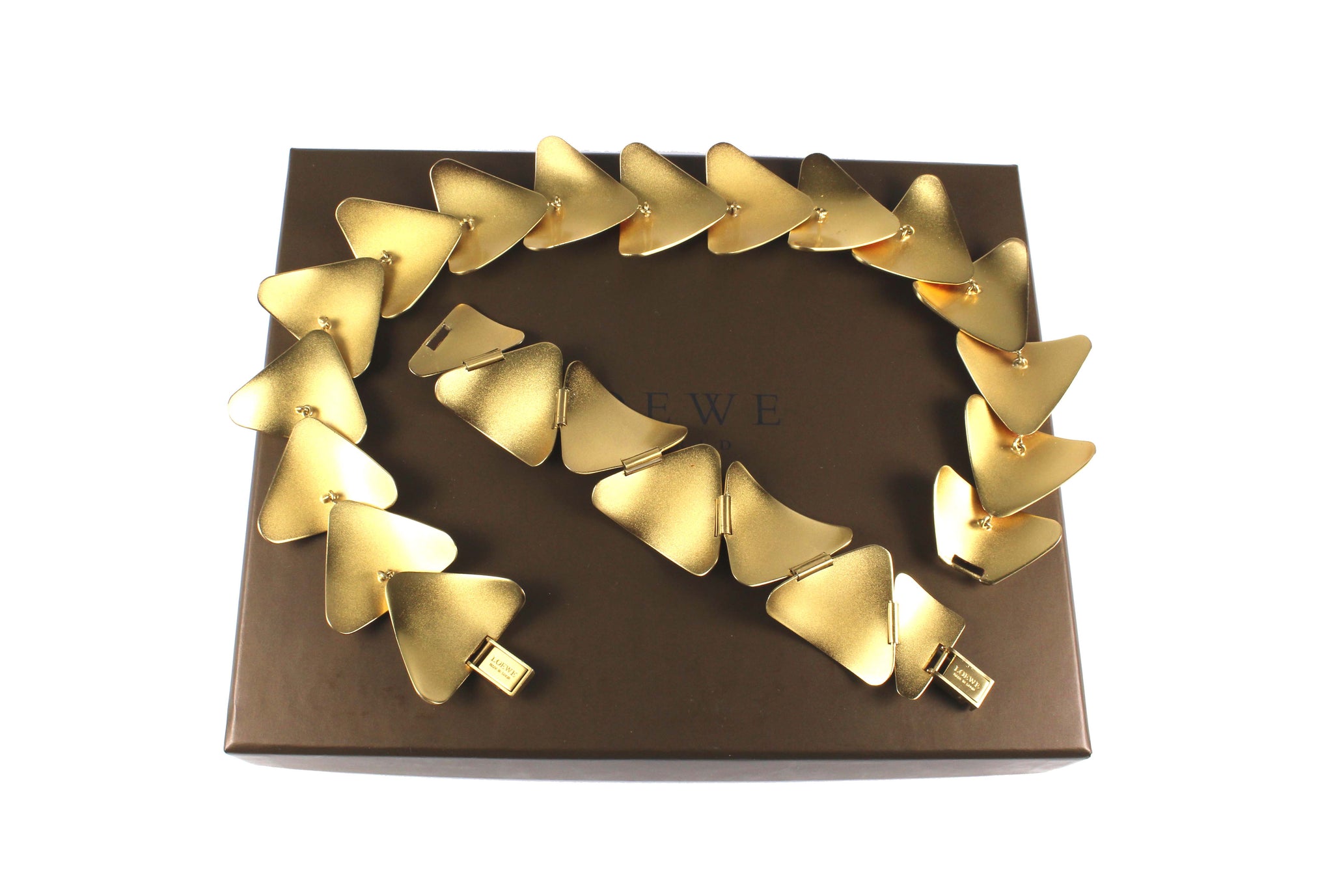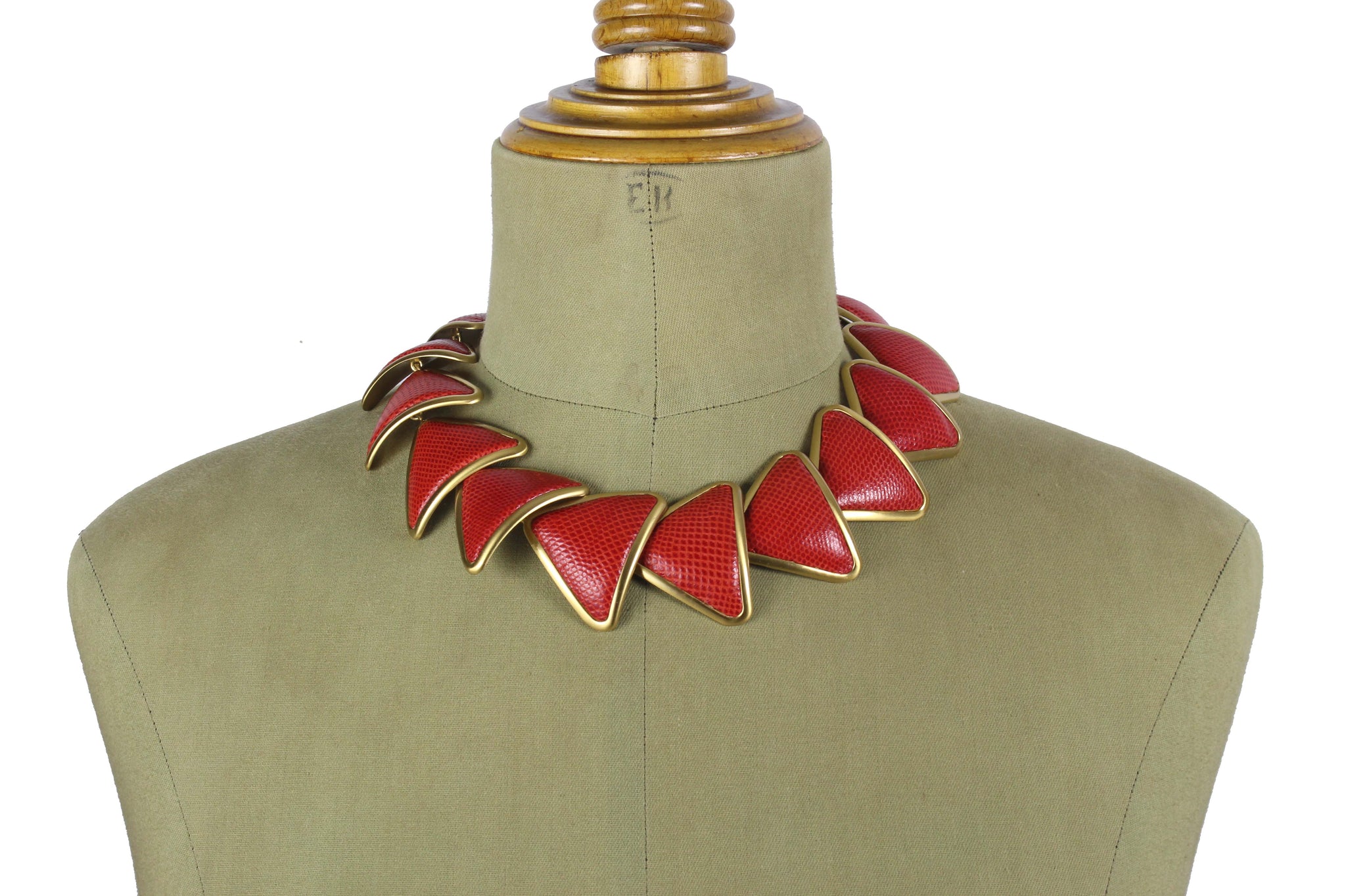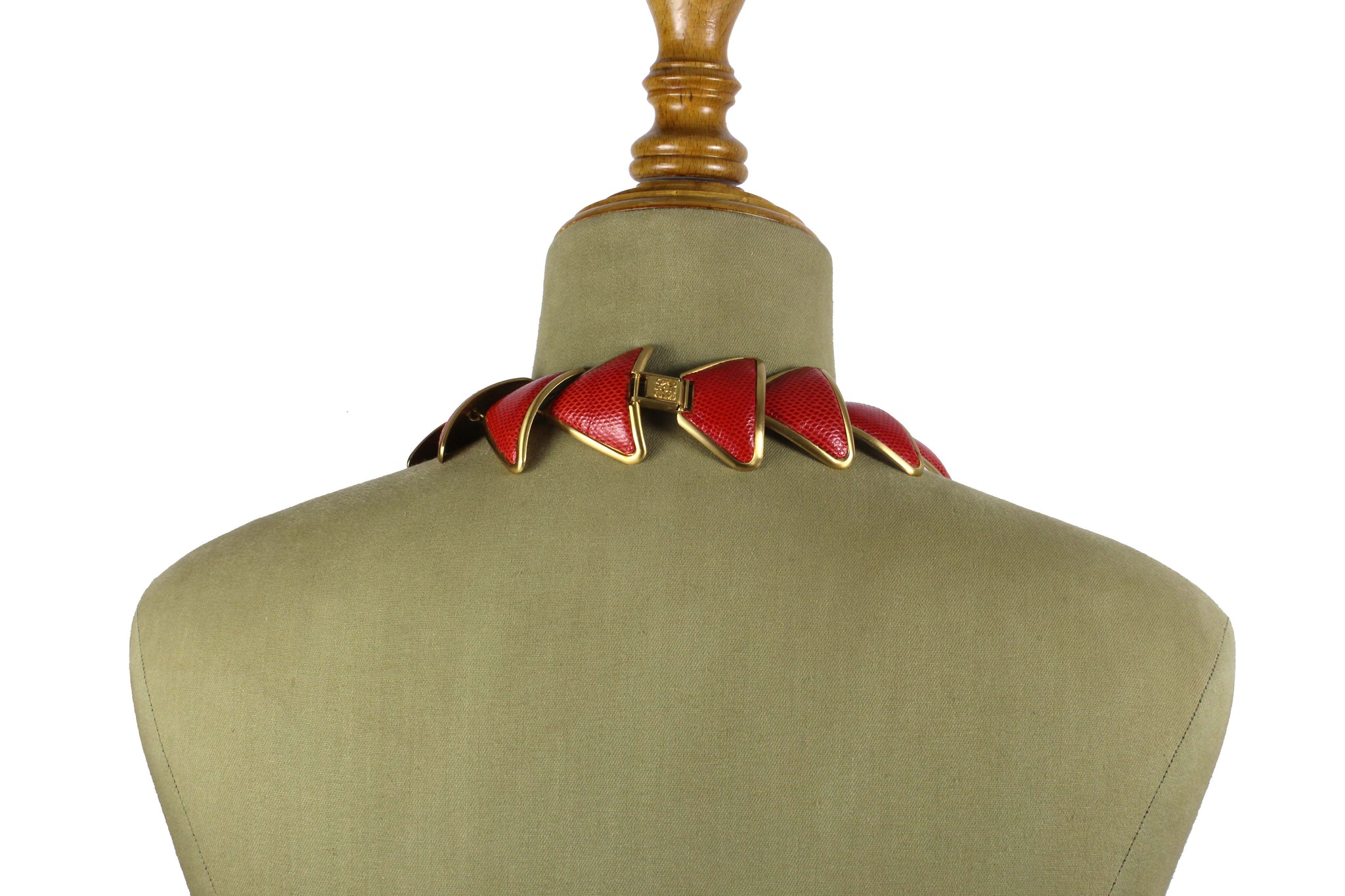 LOEWE, made in Spain, 2000's vintage necklace and bracelet set. Gold-tone metal triangle links covered in genuine red lizard skin, sliding drawer clasp, signed. Excellent condition, some small stains, see last image. Delivered in original Loewe box.
