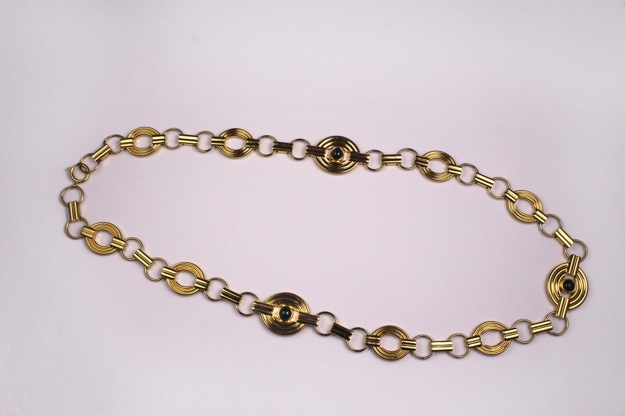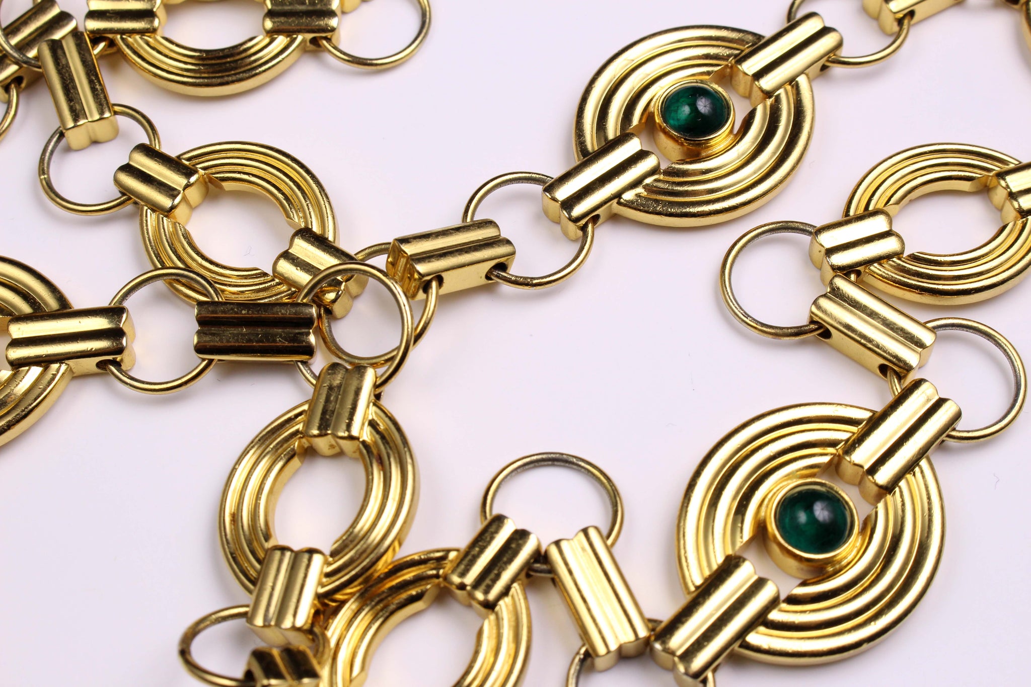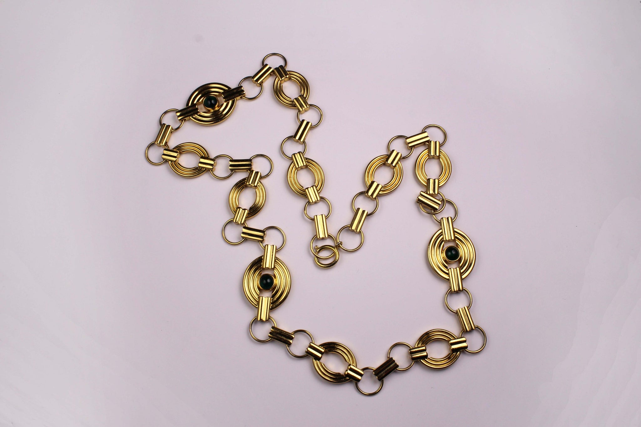 LOEWE, made in Spain, vintage gold-tone metal necklace with circular and oval links, featuring three larger oval main links with a green stone cabochon, lobster clasp, signed. Delivered in original Loewe box.