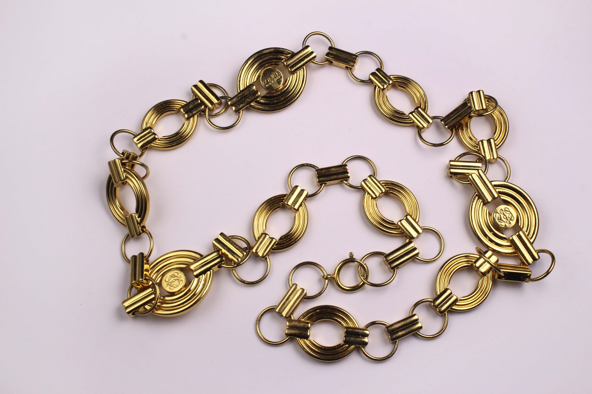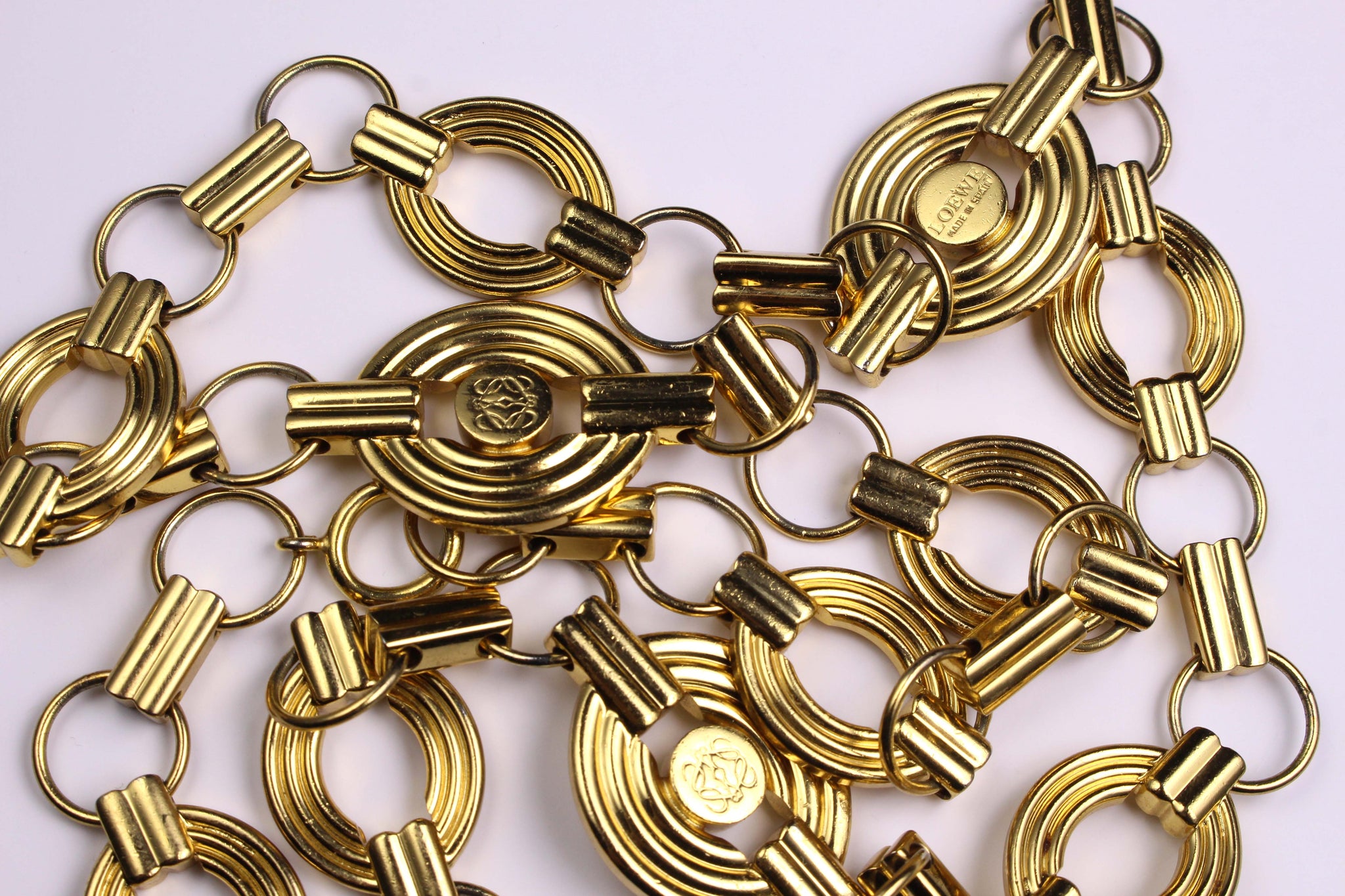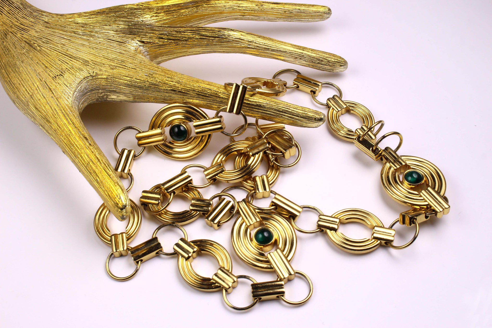LOEWE, made in Spain, vintage gold-tone metal necklace with circular and oval links, featuring three larger oval main links with a green stone cabochon, lobster clasp, signed. Delivered in original Loewe box.