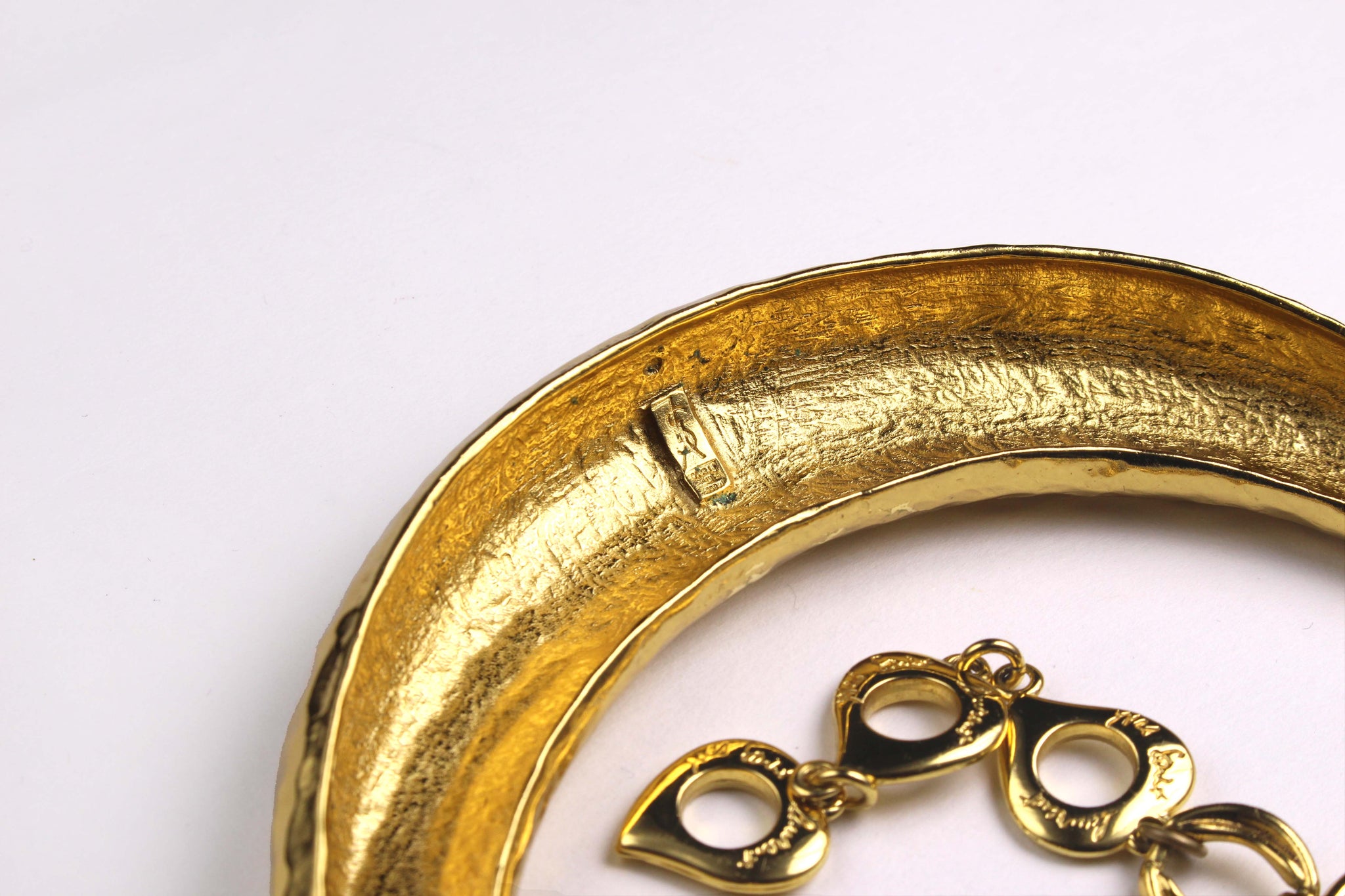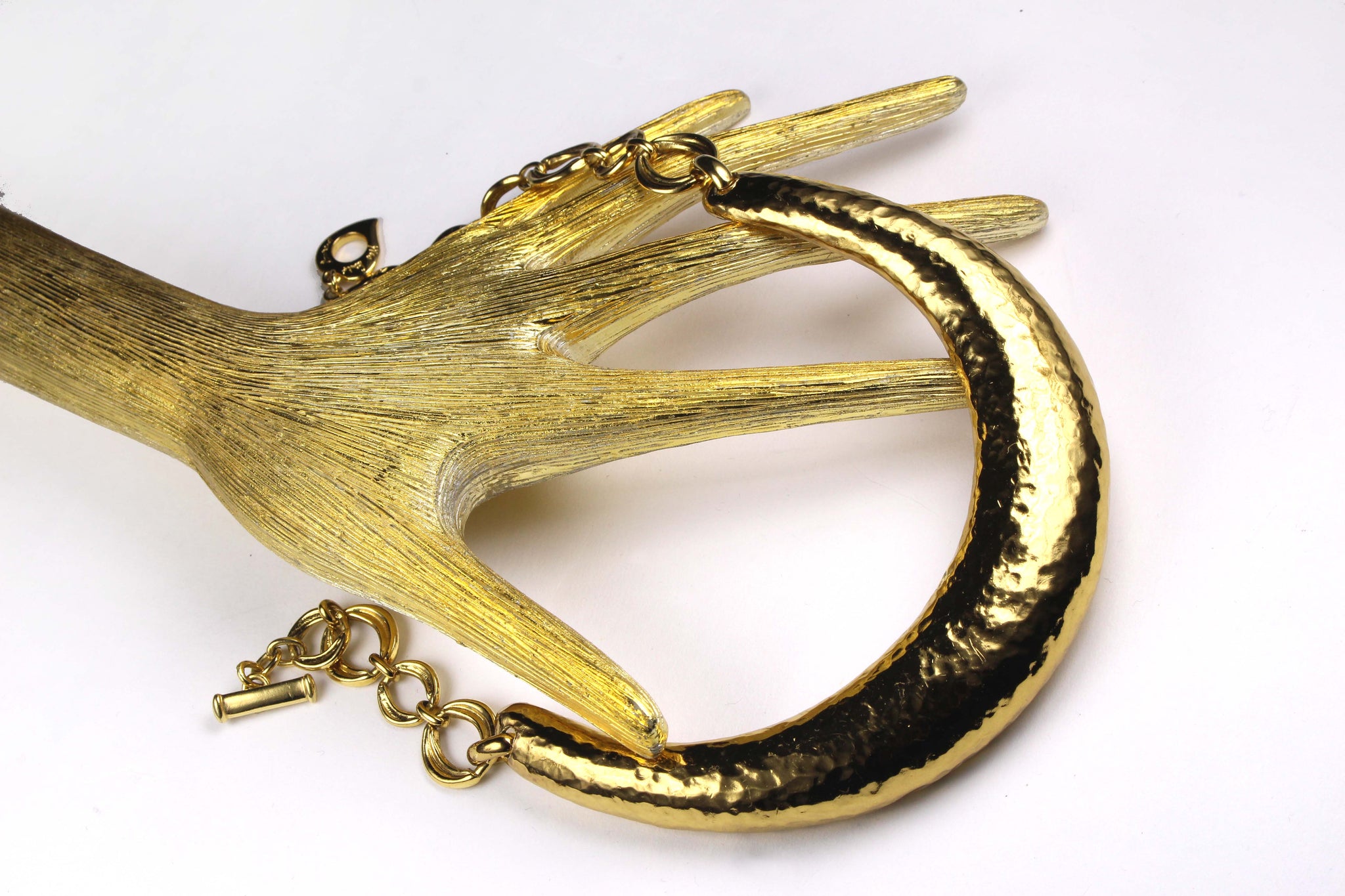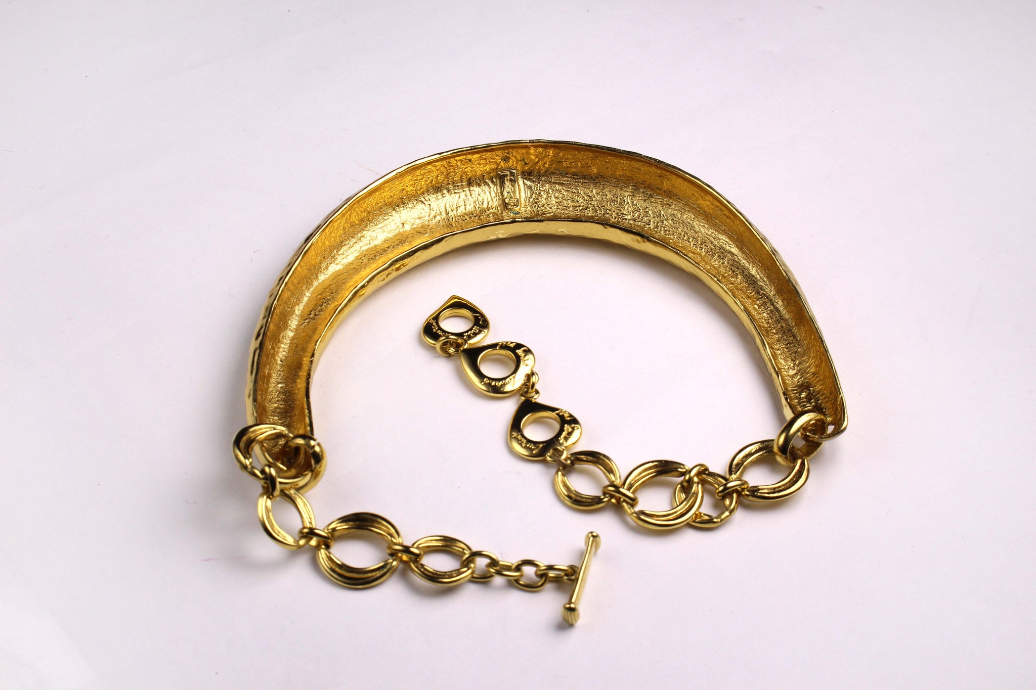 Vintage YVES SAINT LAURENT, made in France, vintage gold metal hammered rigid bib necklace, with three-position toggle clasp closure. Signed on the back.