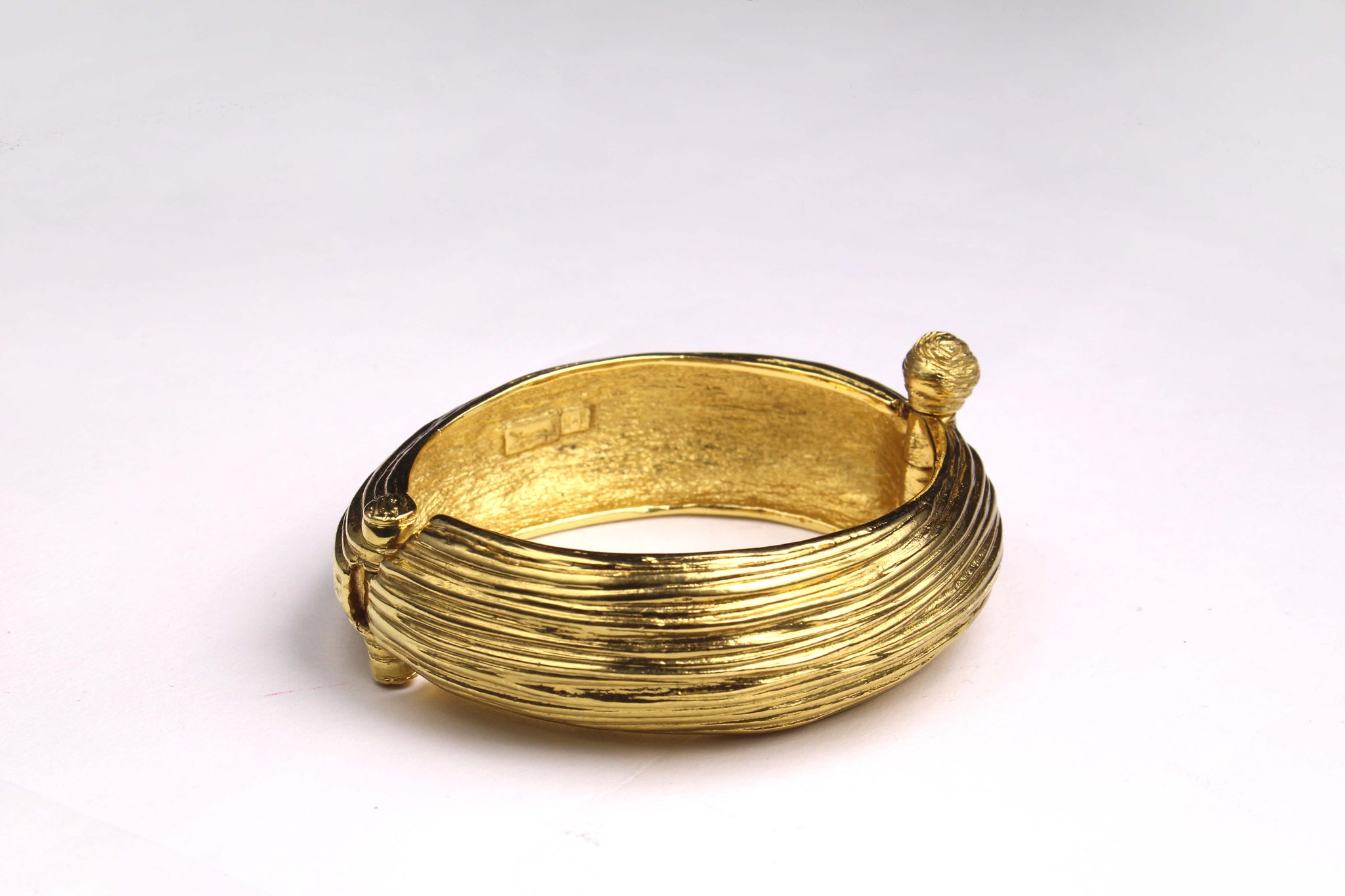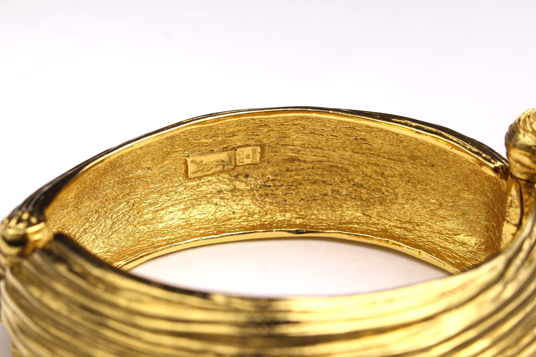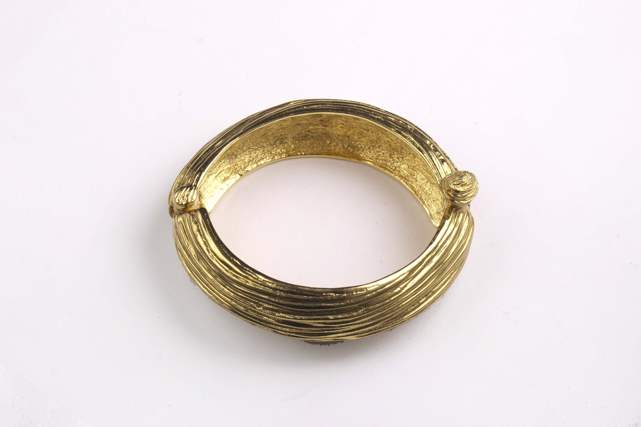 YVES SAINT LAURENT, made in France, vintage rigid bracelet of irregularly grooved textured gold-tone metal, with side hinge and side pin screw closure. Signed on the back.