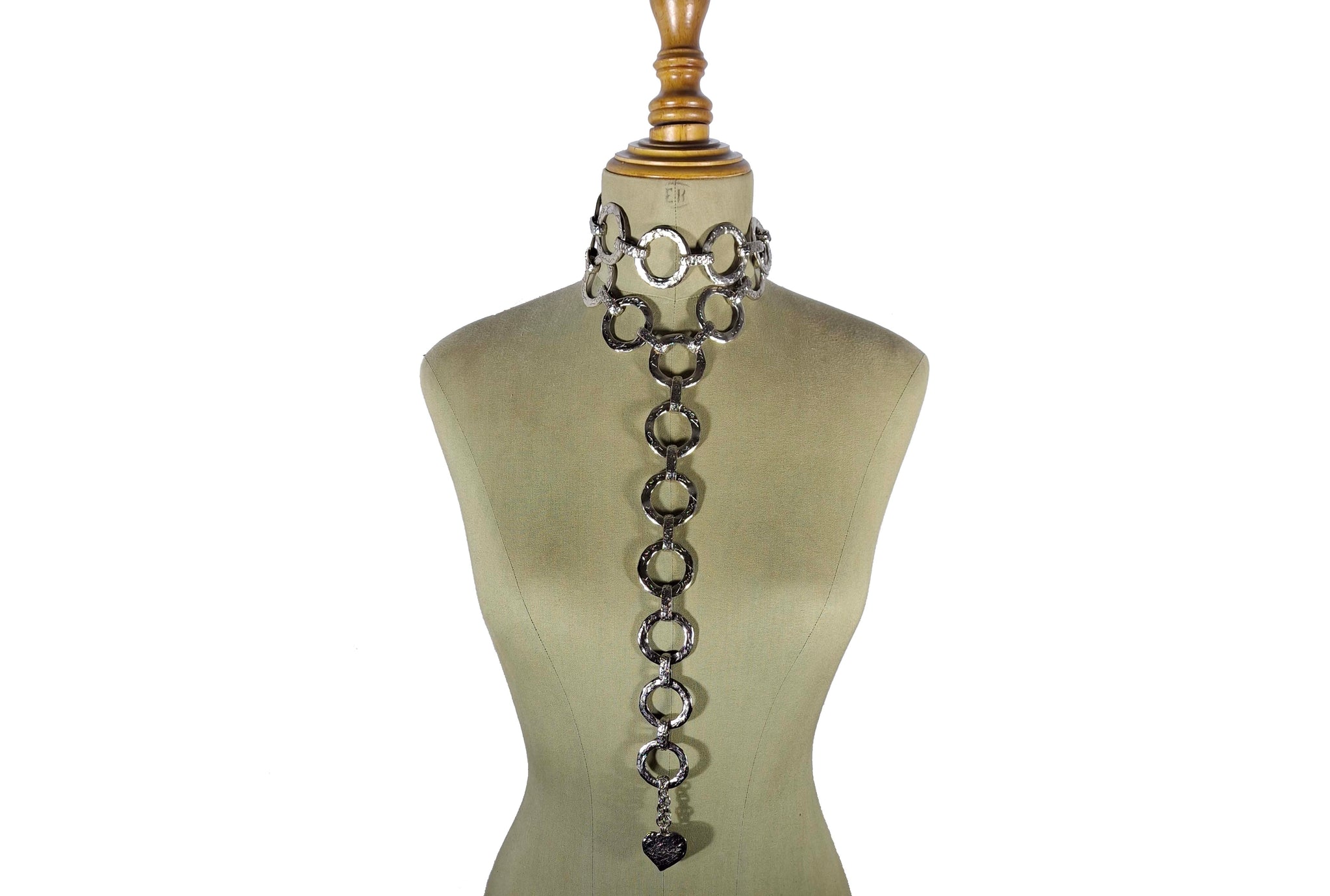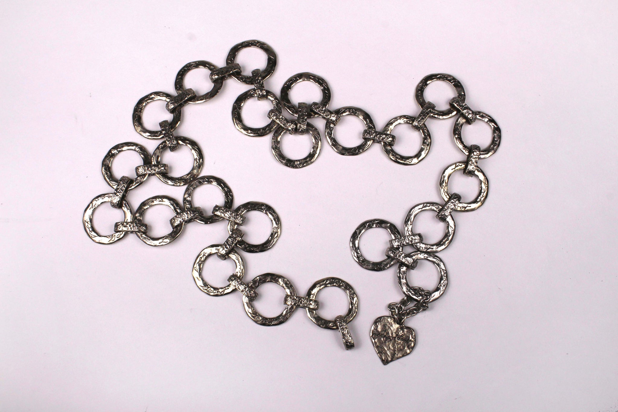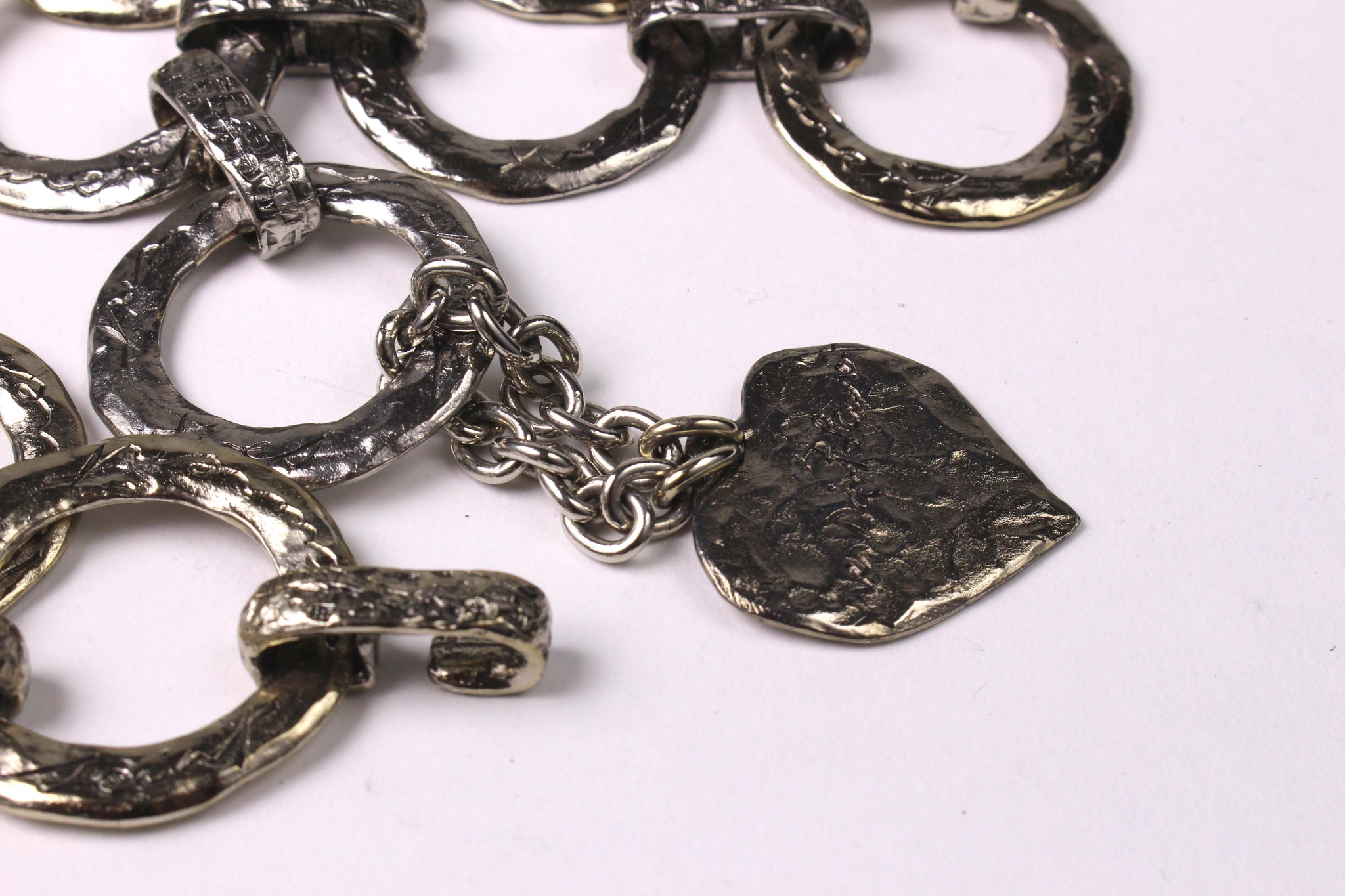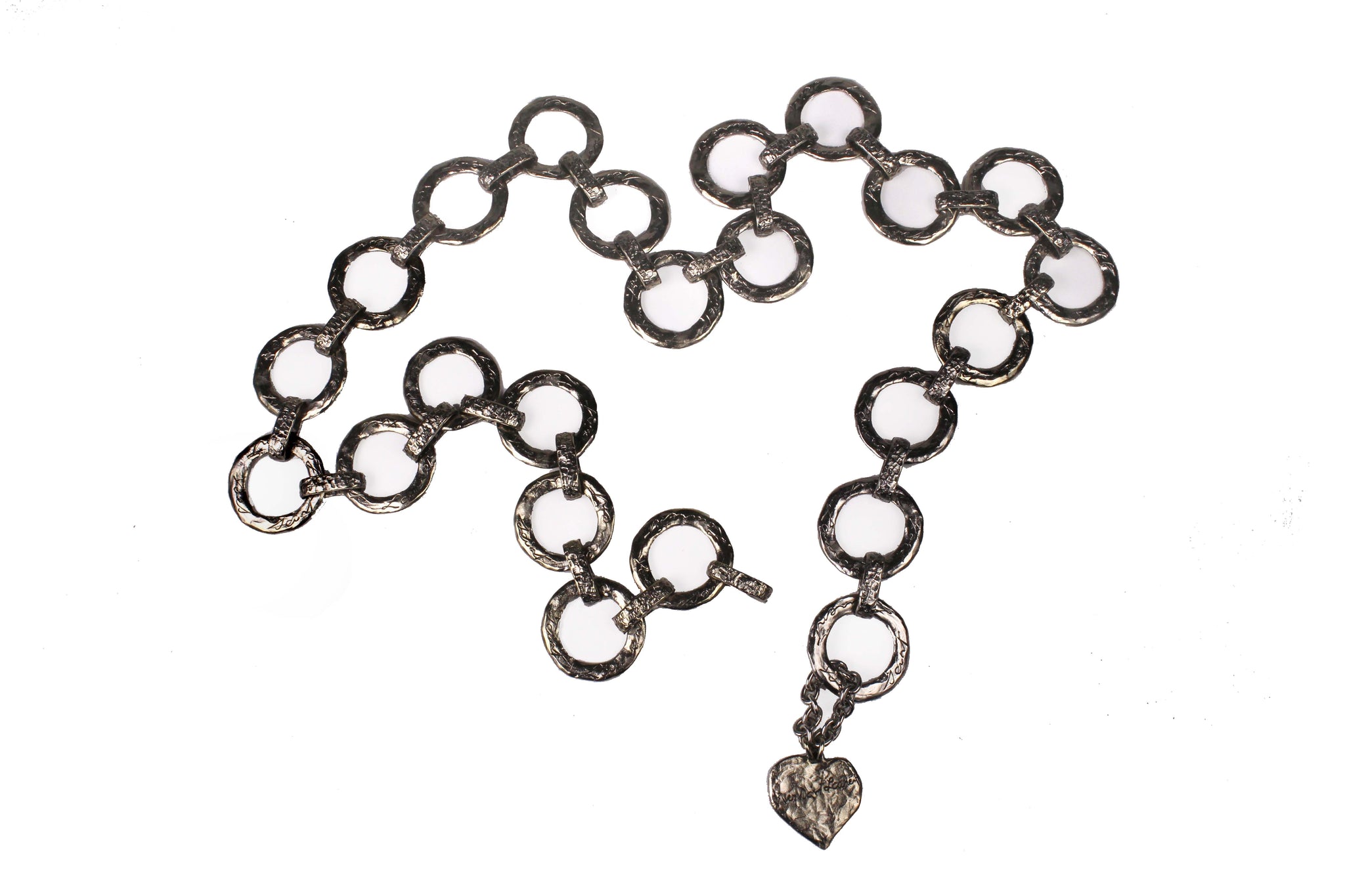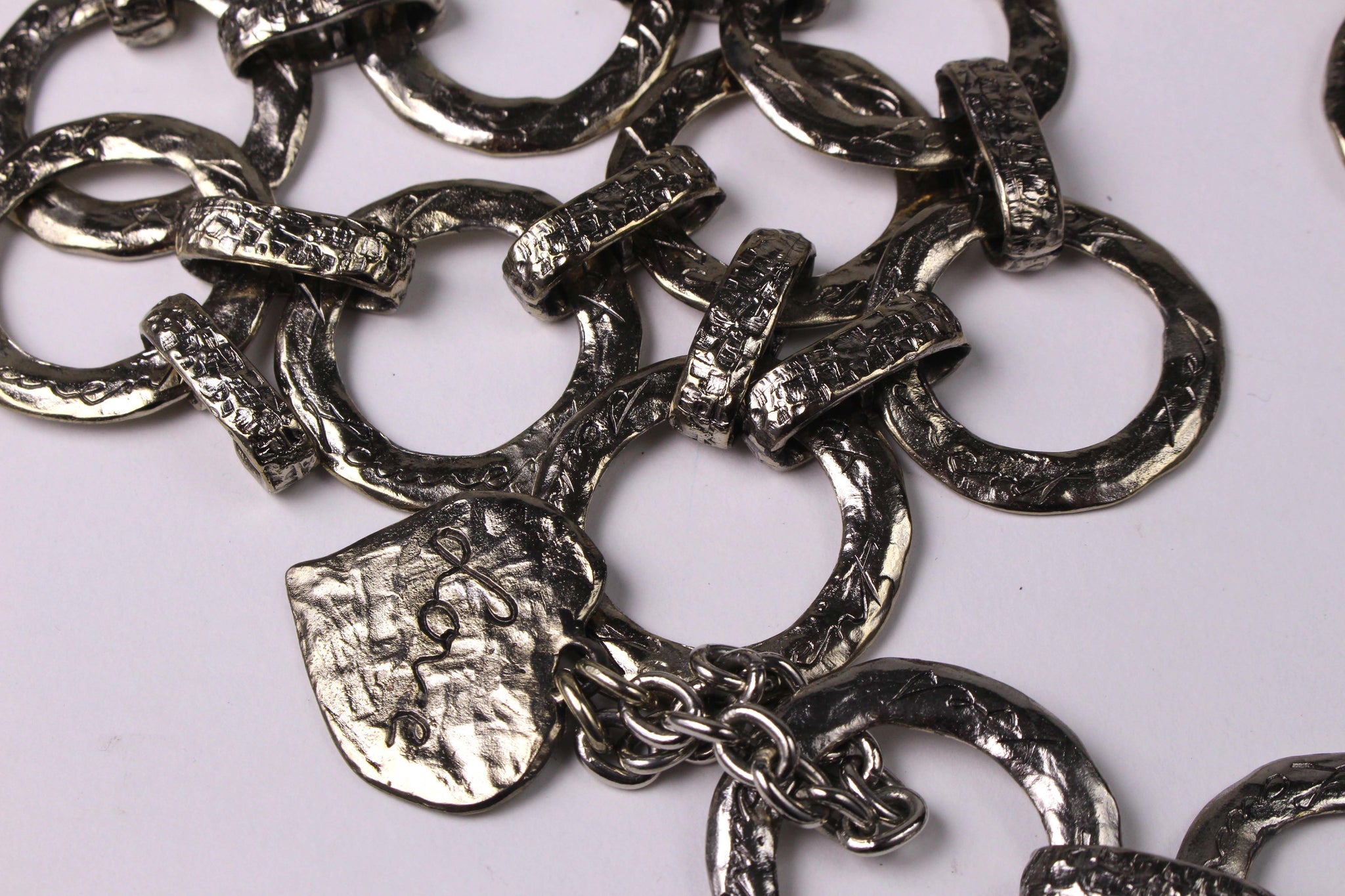 YVES SAINT LAURENT, made in France, vintage 1980's belt with flat ring links in hammered silver metal, each signed by Yves Saint Laurent in cursive, ending with a hanging heart signed Love. Adjustable hook closure. It can also be used as a necklace.