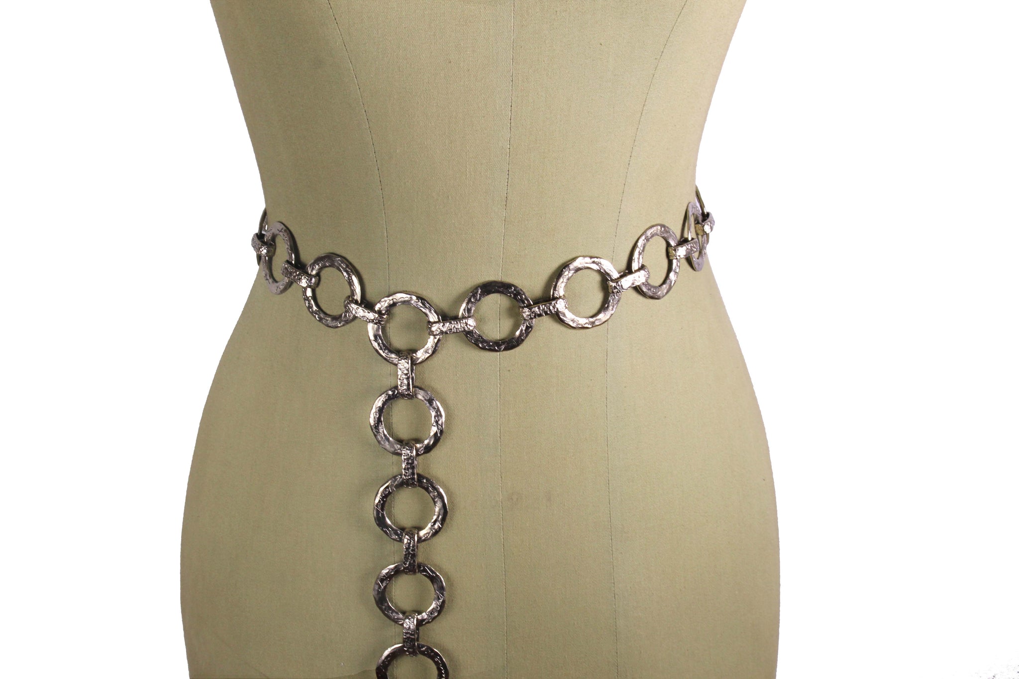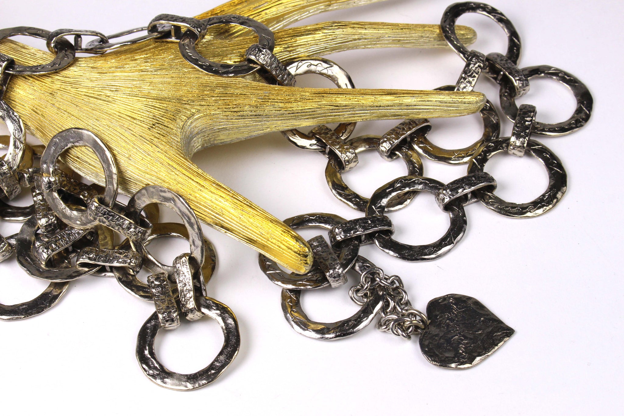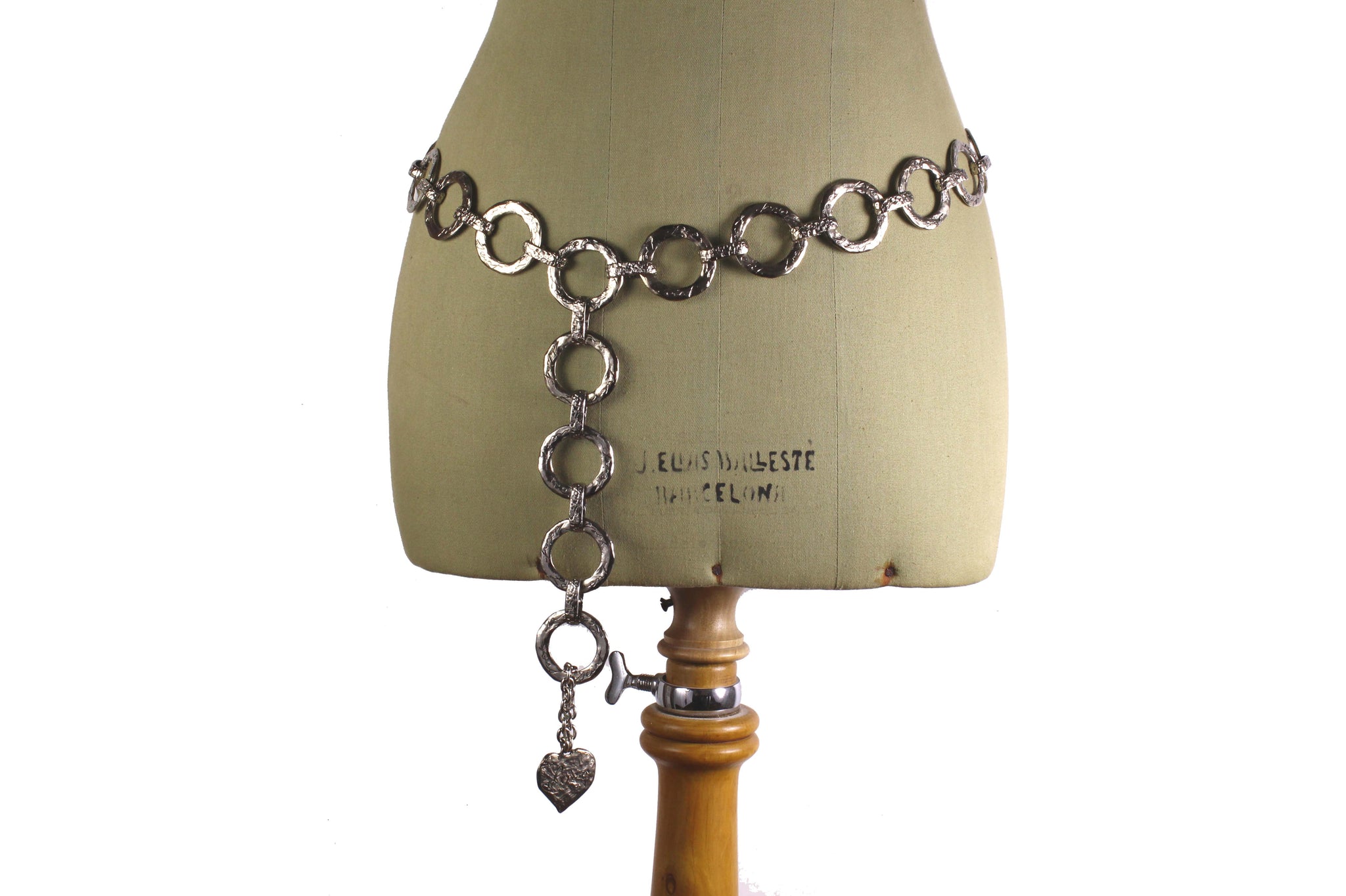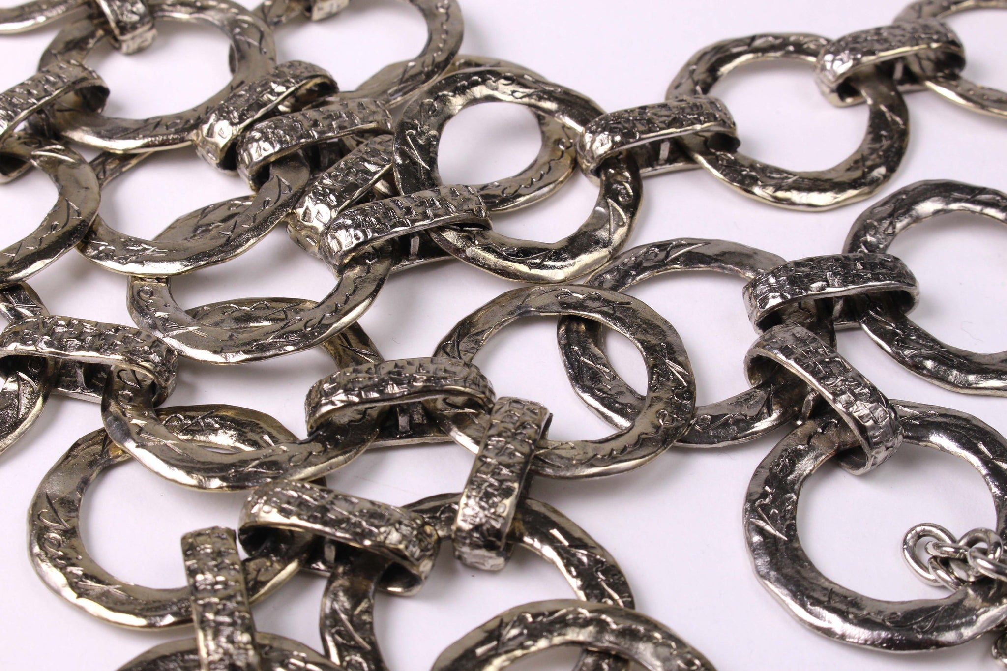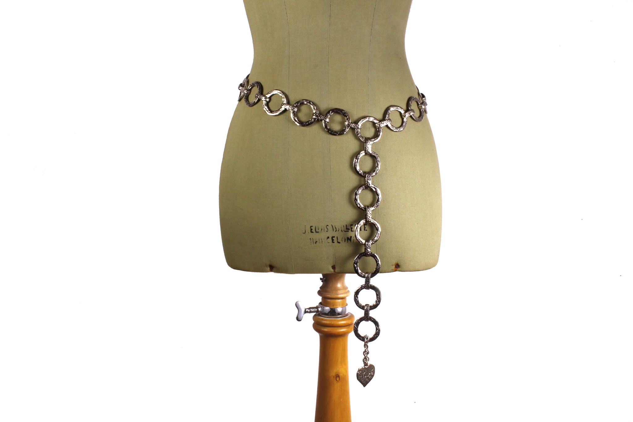 YVES SAINT LAURENT, made in France, vintage 1980's belt with flat ring links in hammered silver metal, each signed by Yves Saint Laurent in cursive, ending with a hanging heart signed Love. Adjustable hook closure. It can also be used as a necklace.