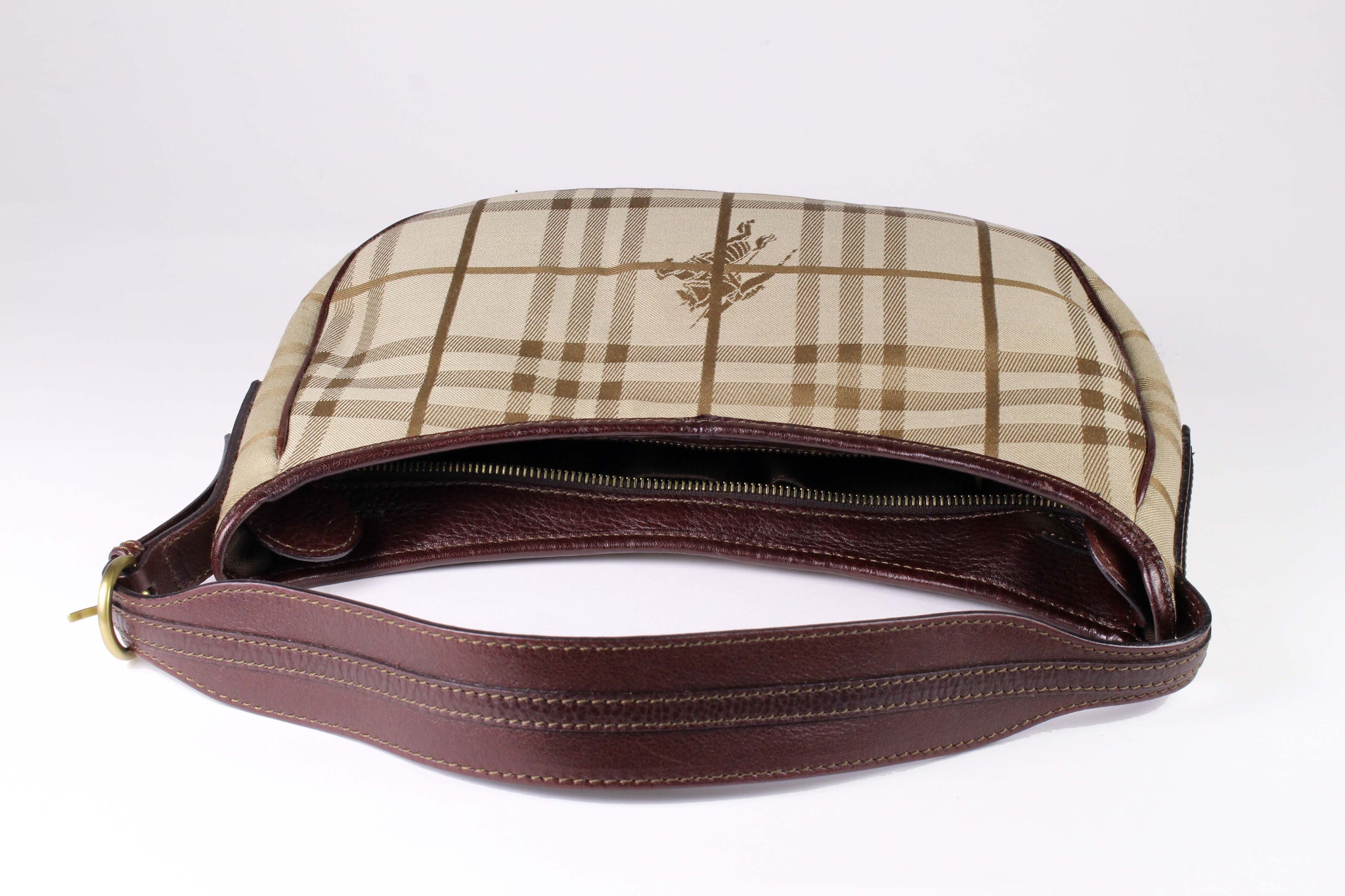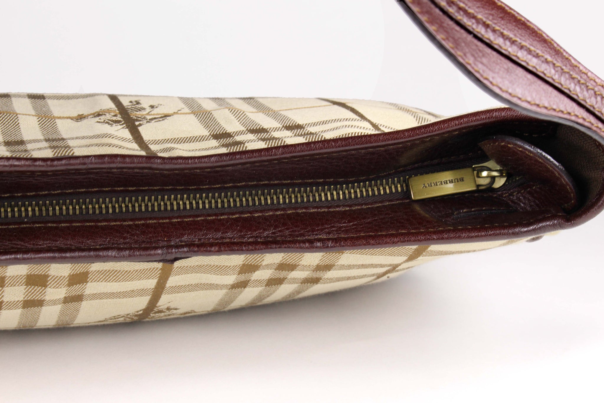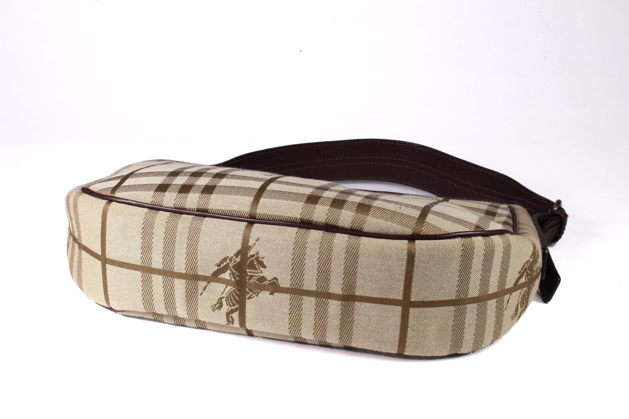 Vintage 2000's Burberry, London, made in Italy, beige haymarket check cloth canvas baguette bag with an elongated shape, featuring a top zip closure and a wide shoulder strap. The top and handle are made of chocolate brown leather, and the strap is adjustable with a buckle on one side in three positions. Leather trim completes the design. The interior is lined with brown canvas and includes one zip pocket and two open side pockets. Number code: T-05-01