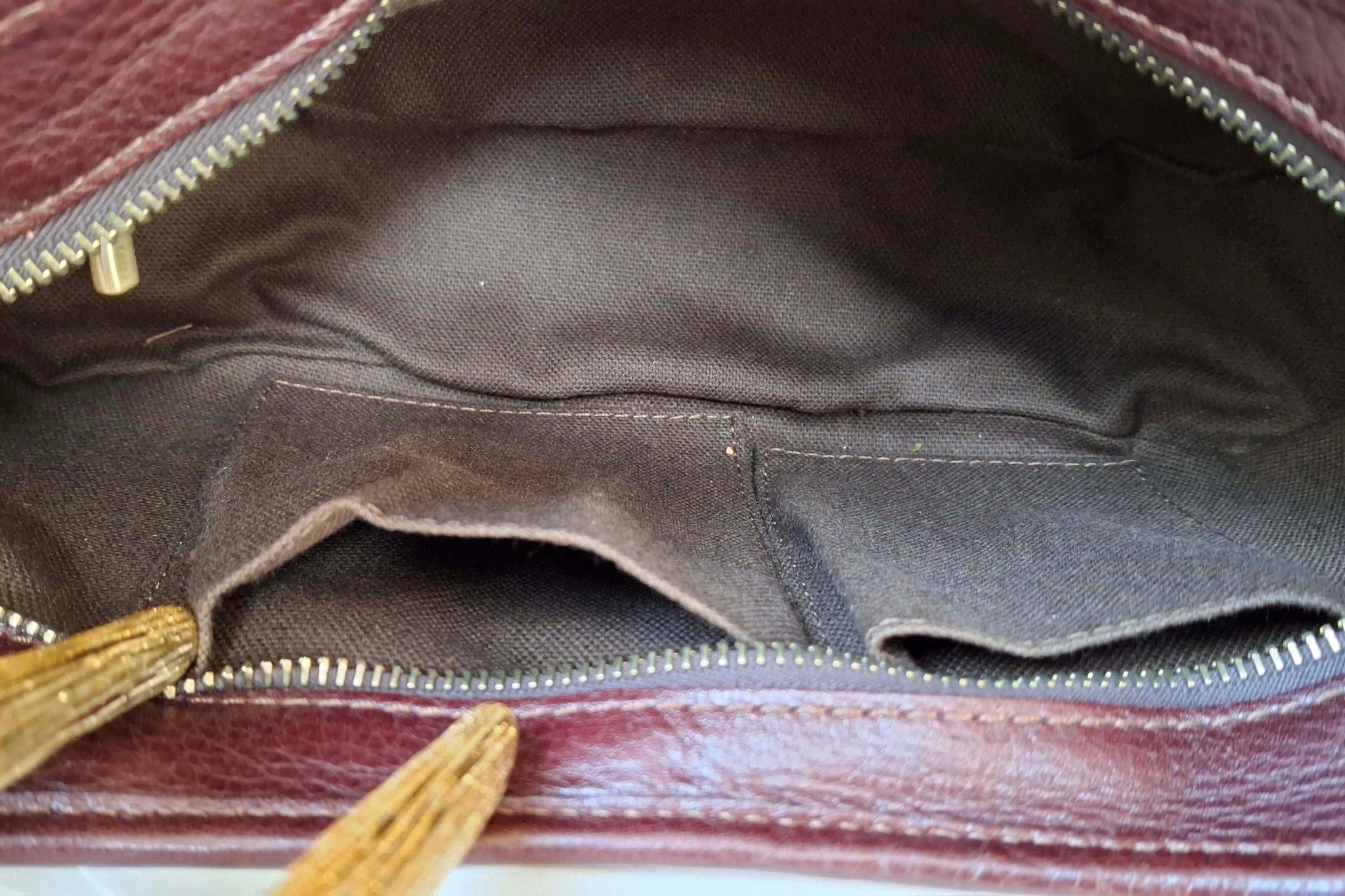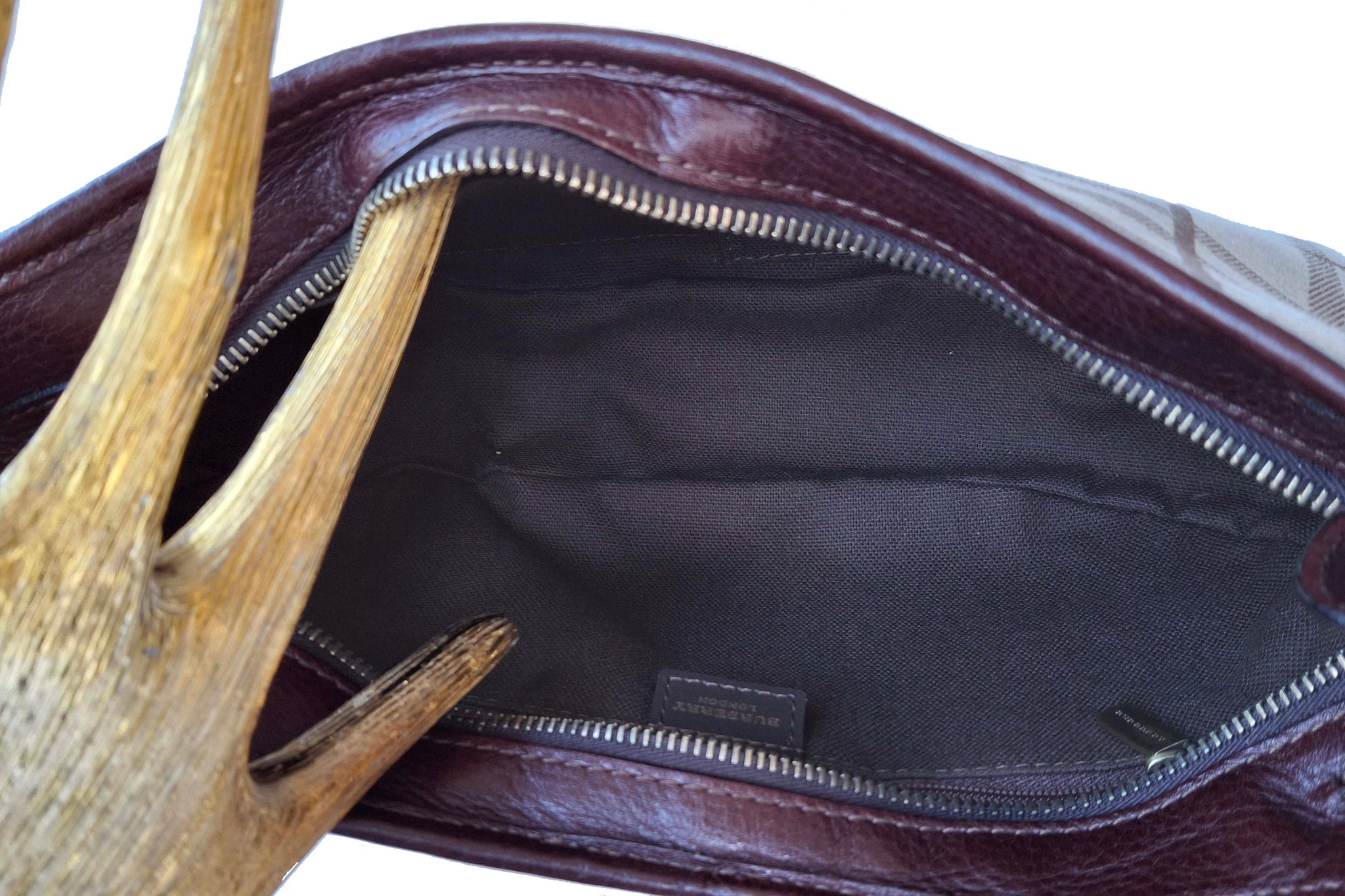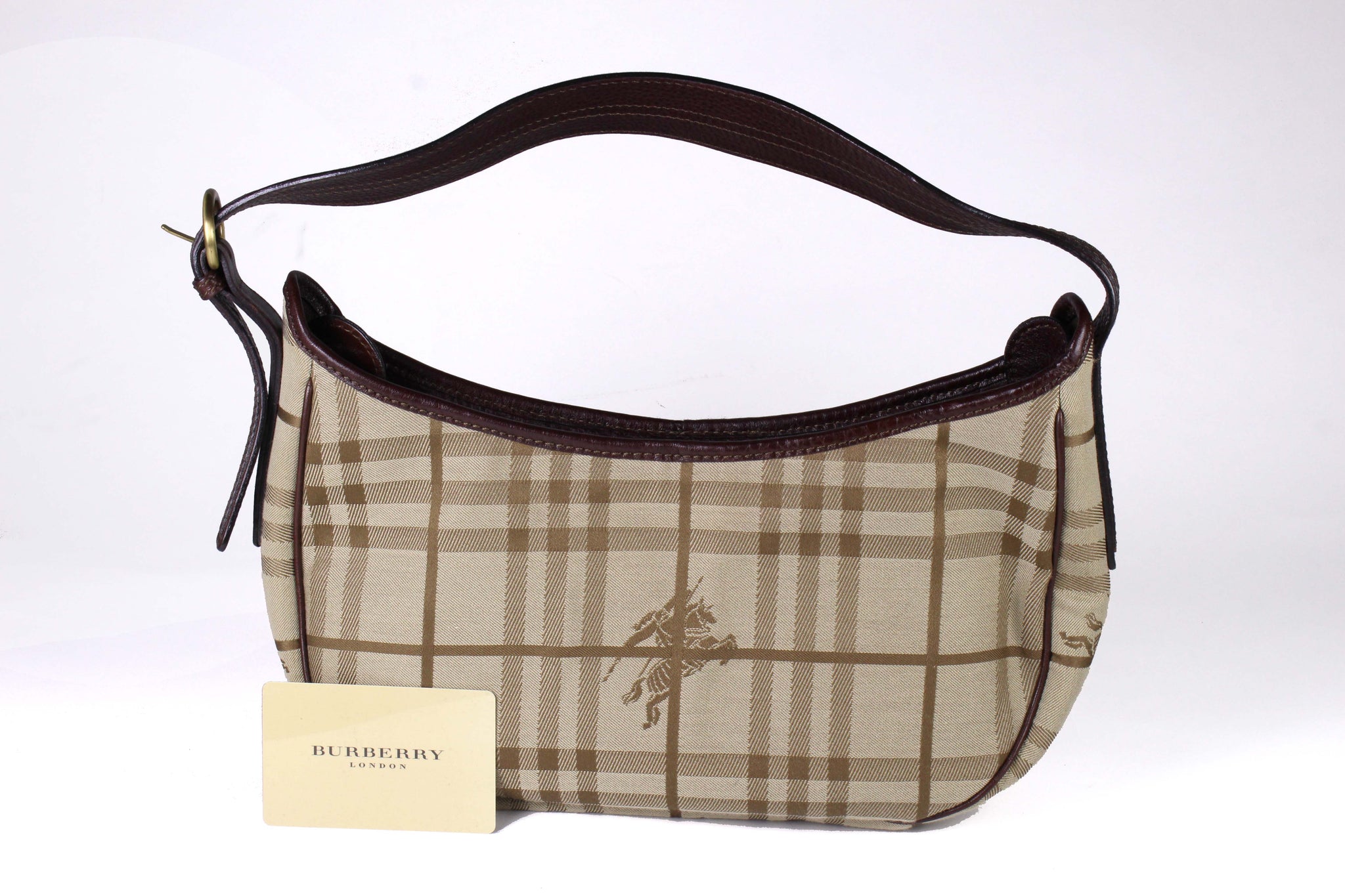 Vintage 2000's Burberry, London, made in Italy, beige haymarket check cloth canvas baguette bag with an elongated shape, featuring a top zip closure and a wide shoulder strap. The top and handle are made of chocolate brown leather, and the strap is adjustable with a buckle on one side in three positions. Leather trim completes the design. The interior is lined with brown canvas and includes one zip pocket and two open side pockets. Number code: T-05-01
