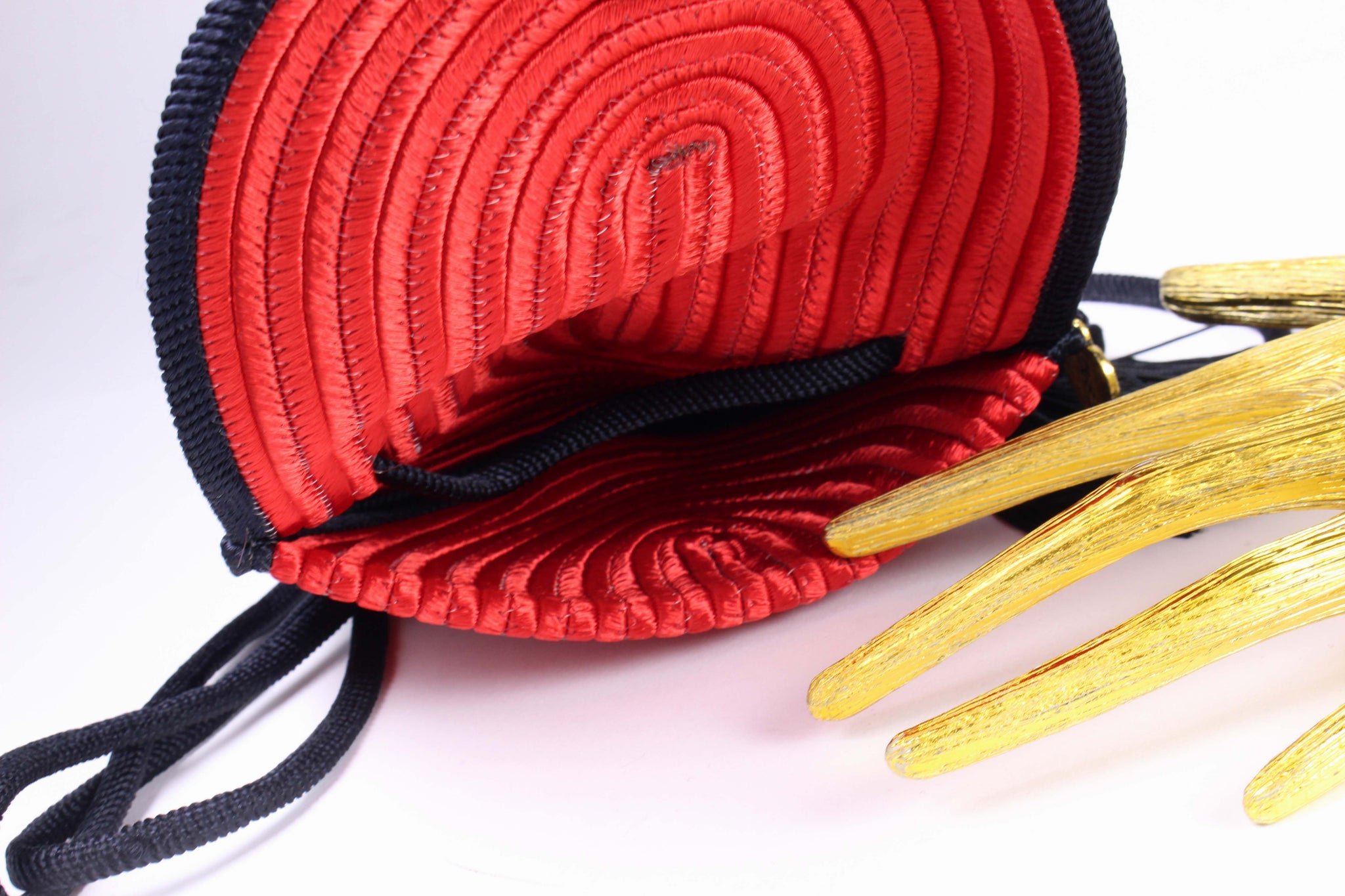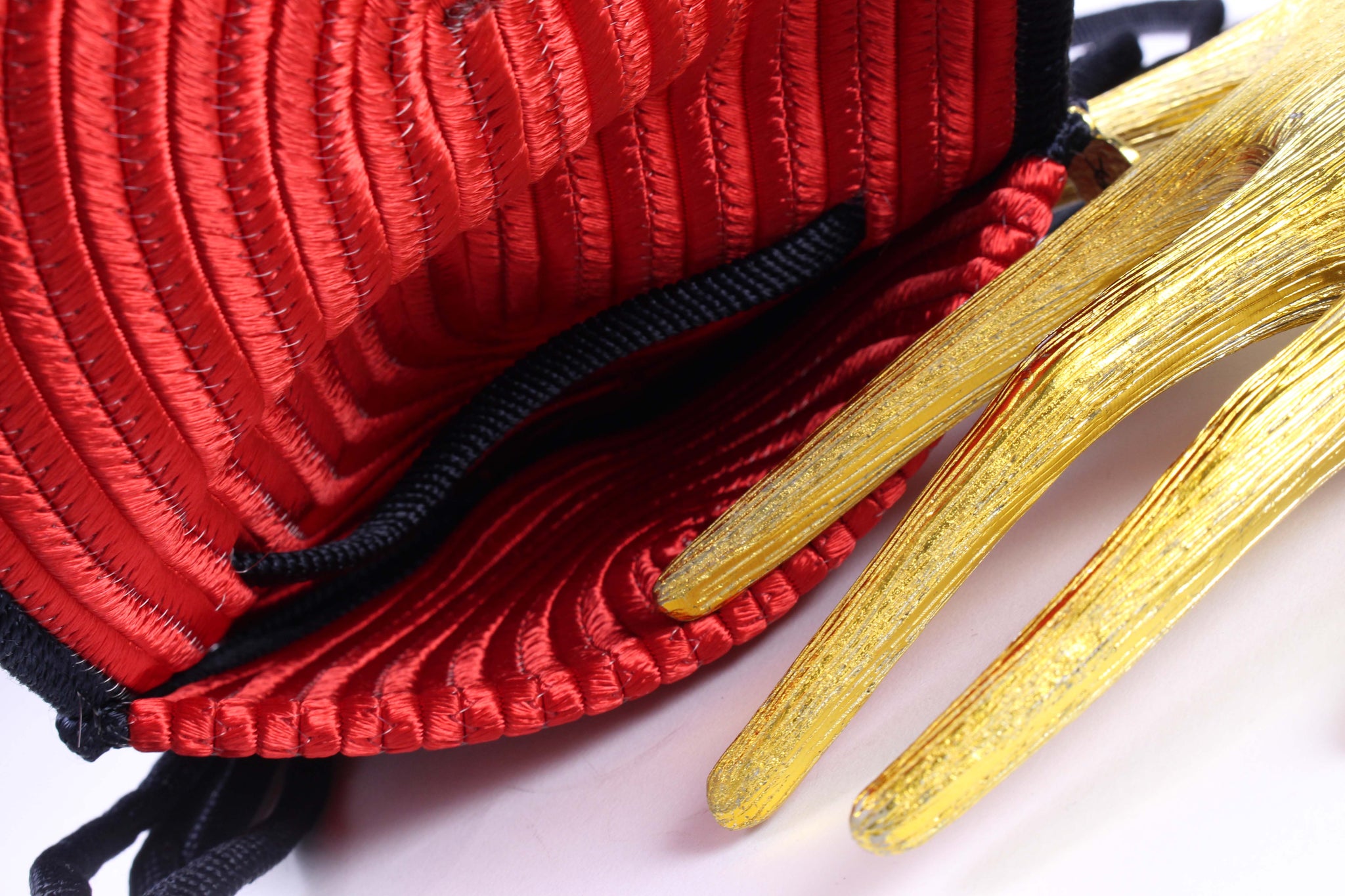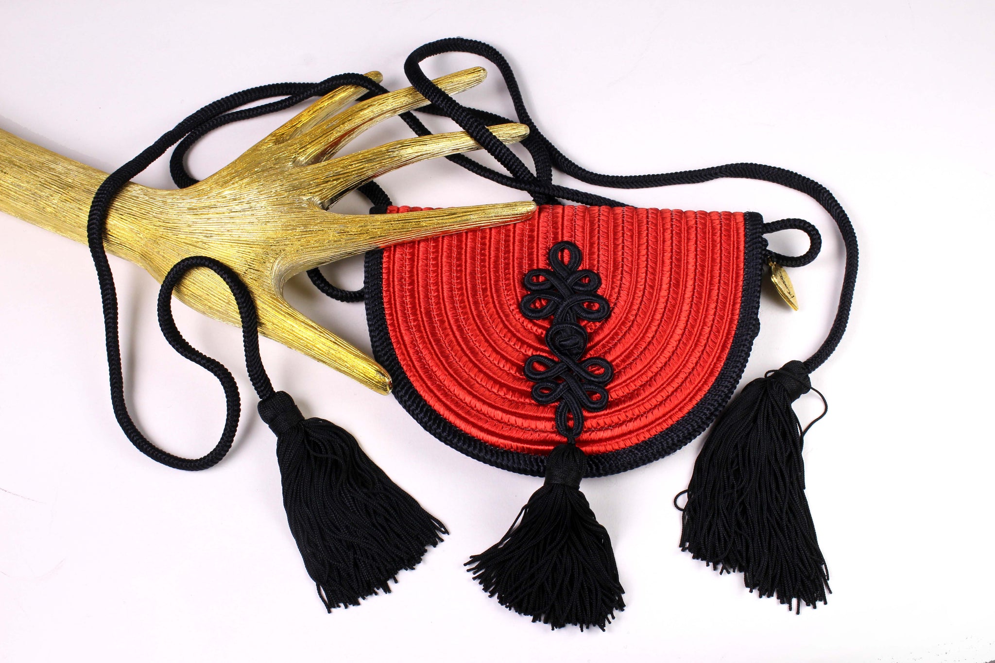 Vintage 1990's YVES SAINT LAURENT, half-moon shape in red and black silk mini passementerie belt bag, with ornaments on the front with black trimmings topped with a large tassel. Very long black cord strap belt with a tassel at each end, with the possibility of multiple positions, also as a crossbody. Small interior with very little capacity.