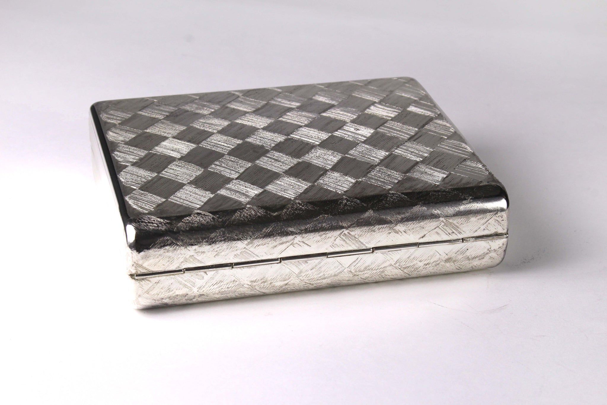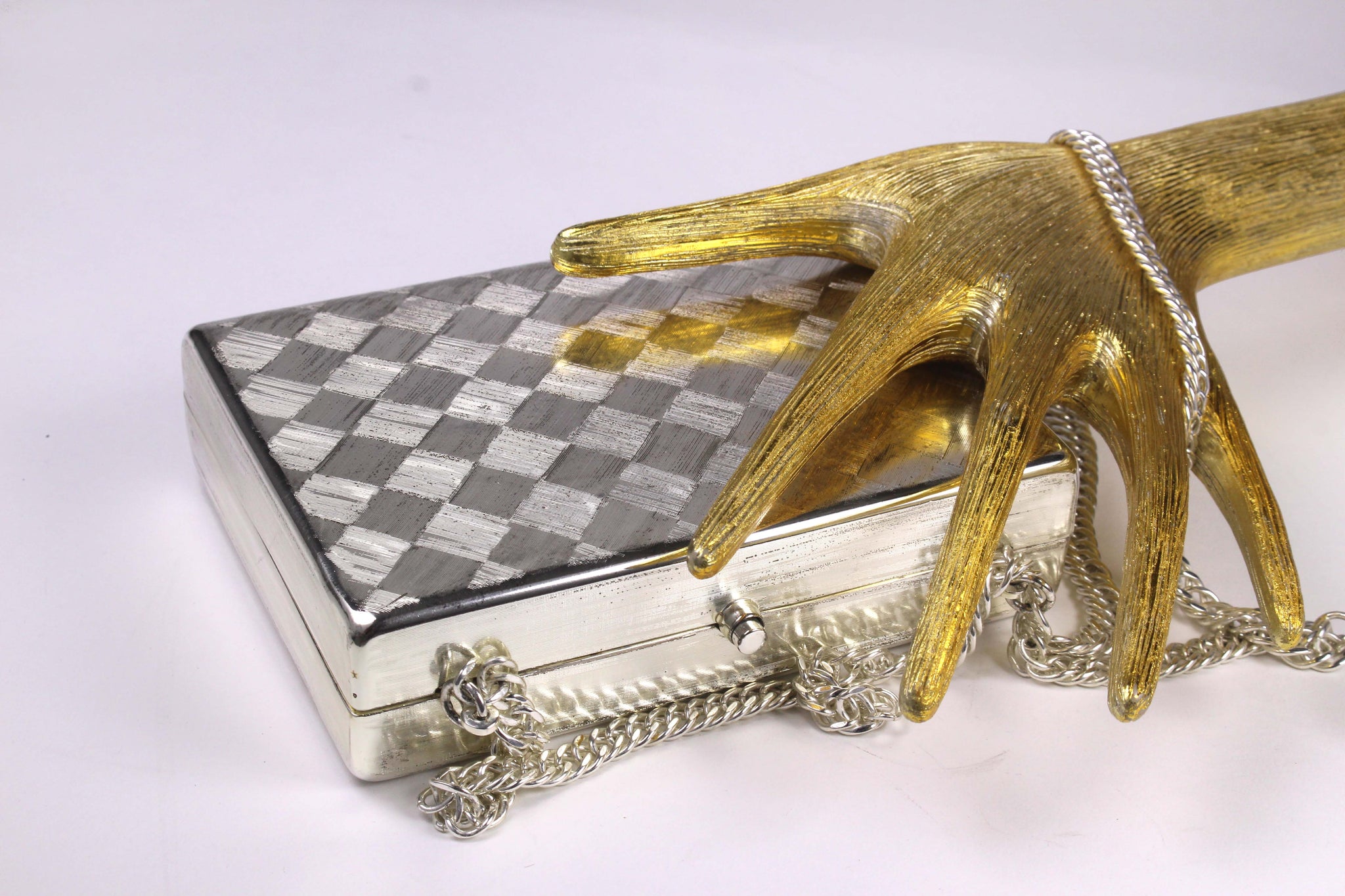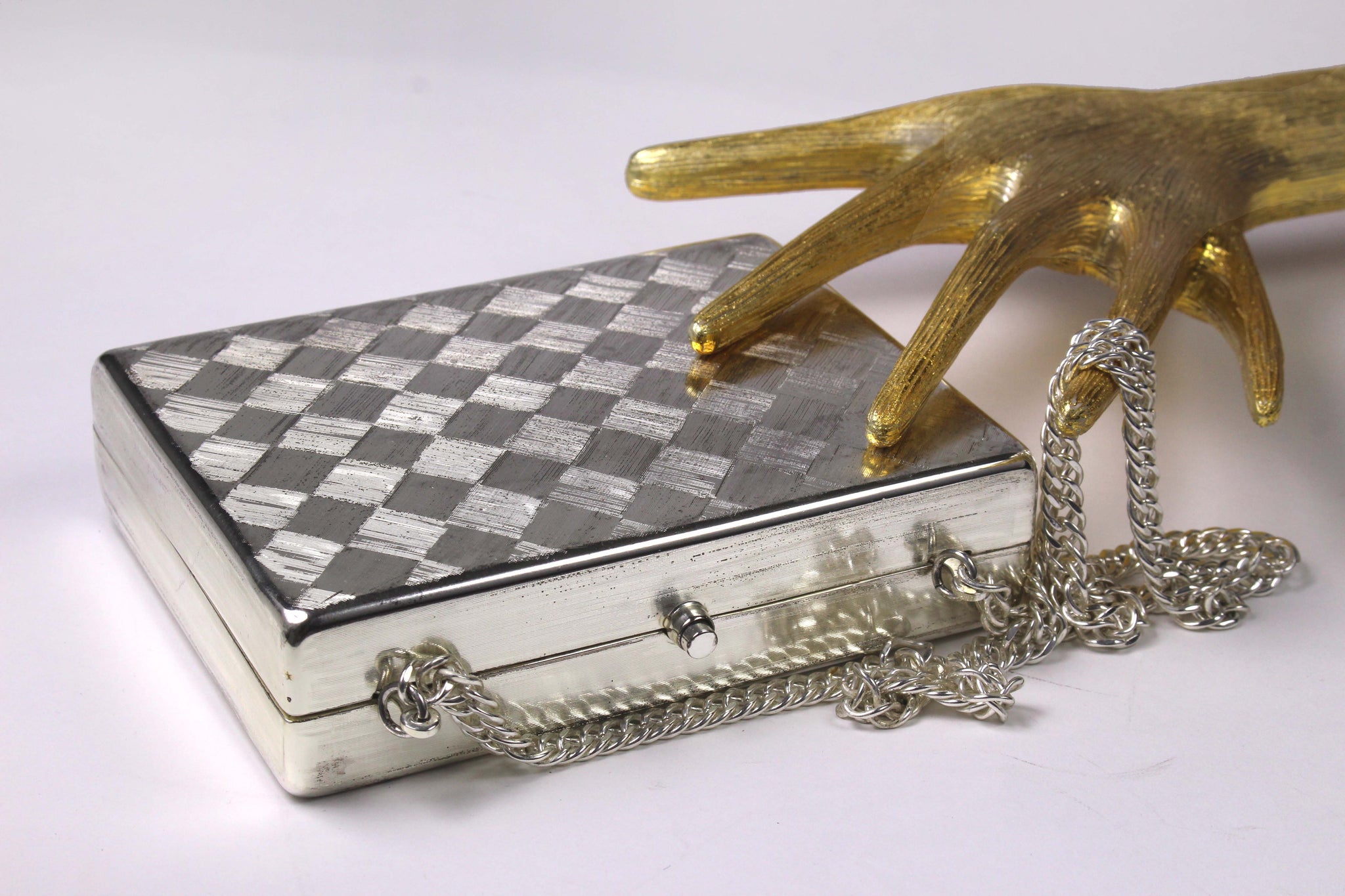 Vintage clutch RODO, Italy, small rectangular format, textured brushed silver metal with a diagonal checkerboard pattern, snap button closure. The interior is finely lined in a spectacular shinning silver fabric, with a small pocket. Shoulder chain provided inside. Excellent condition with minor surface scratches.