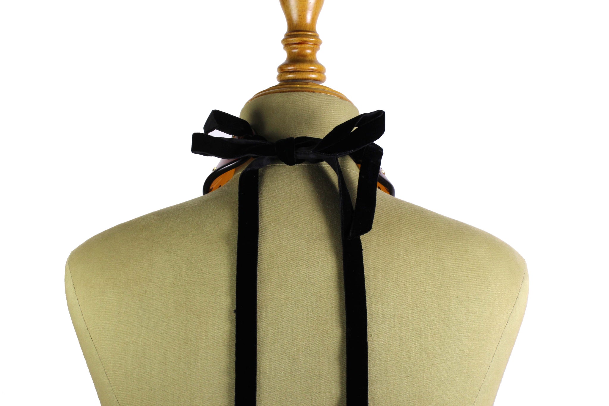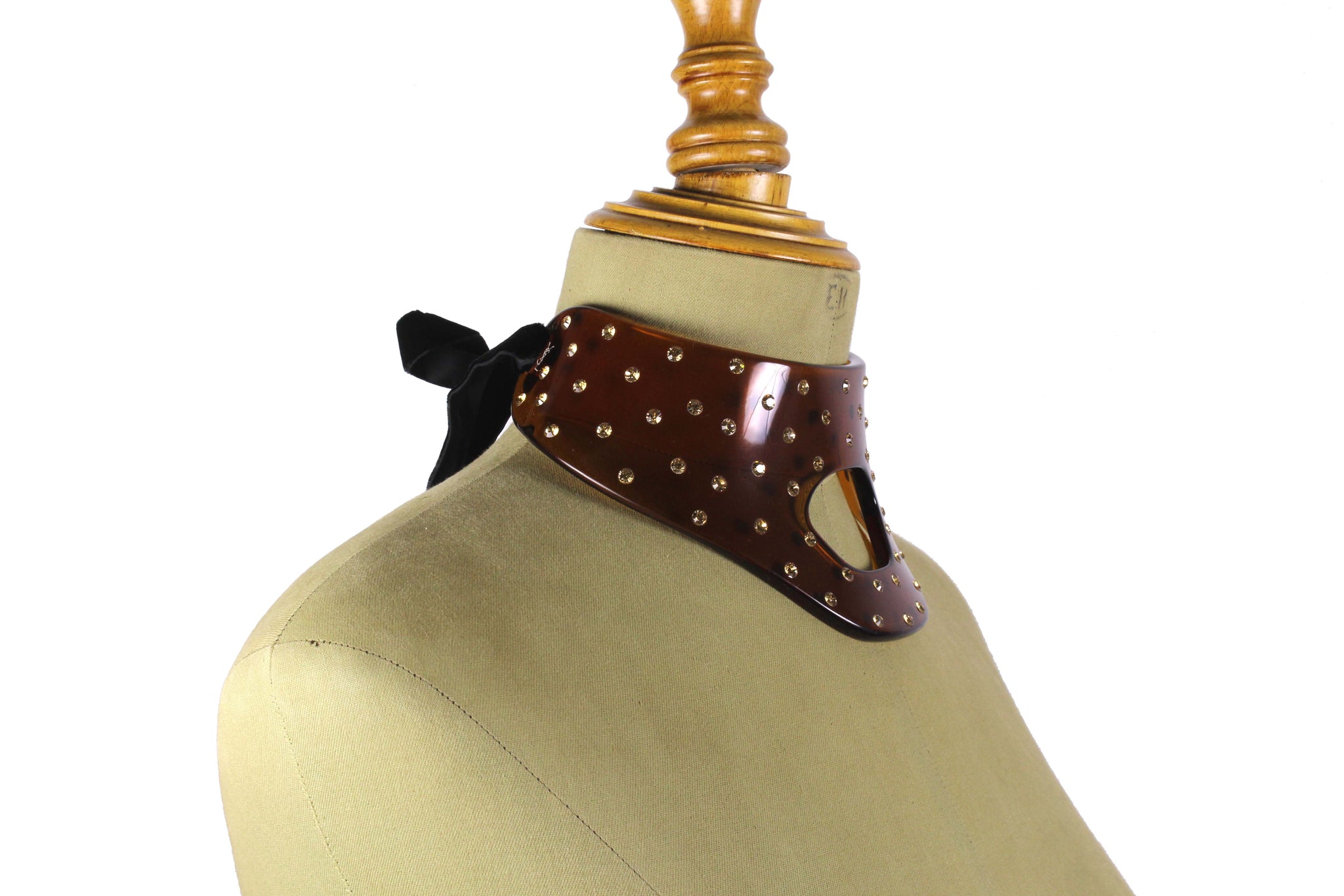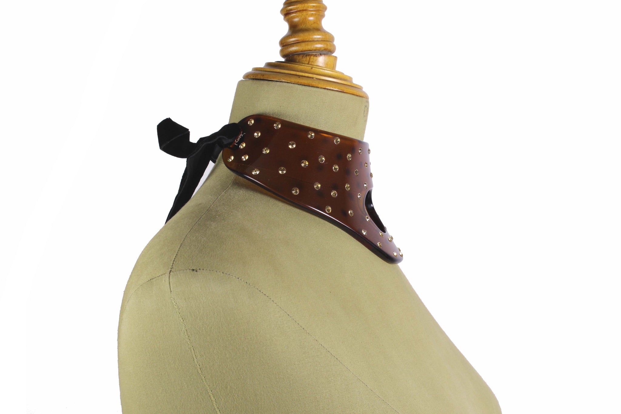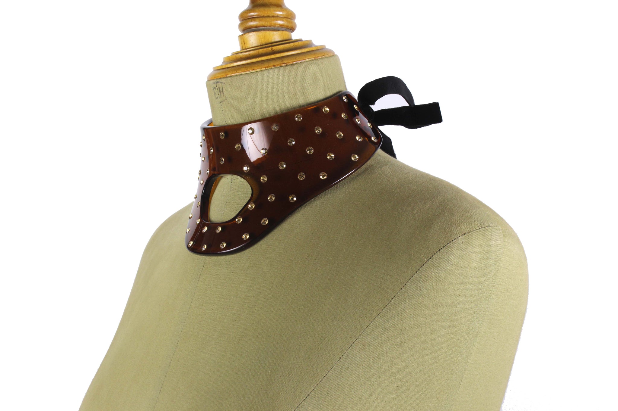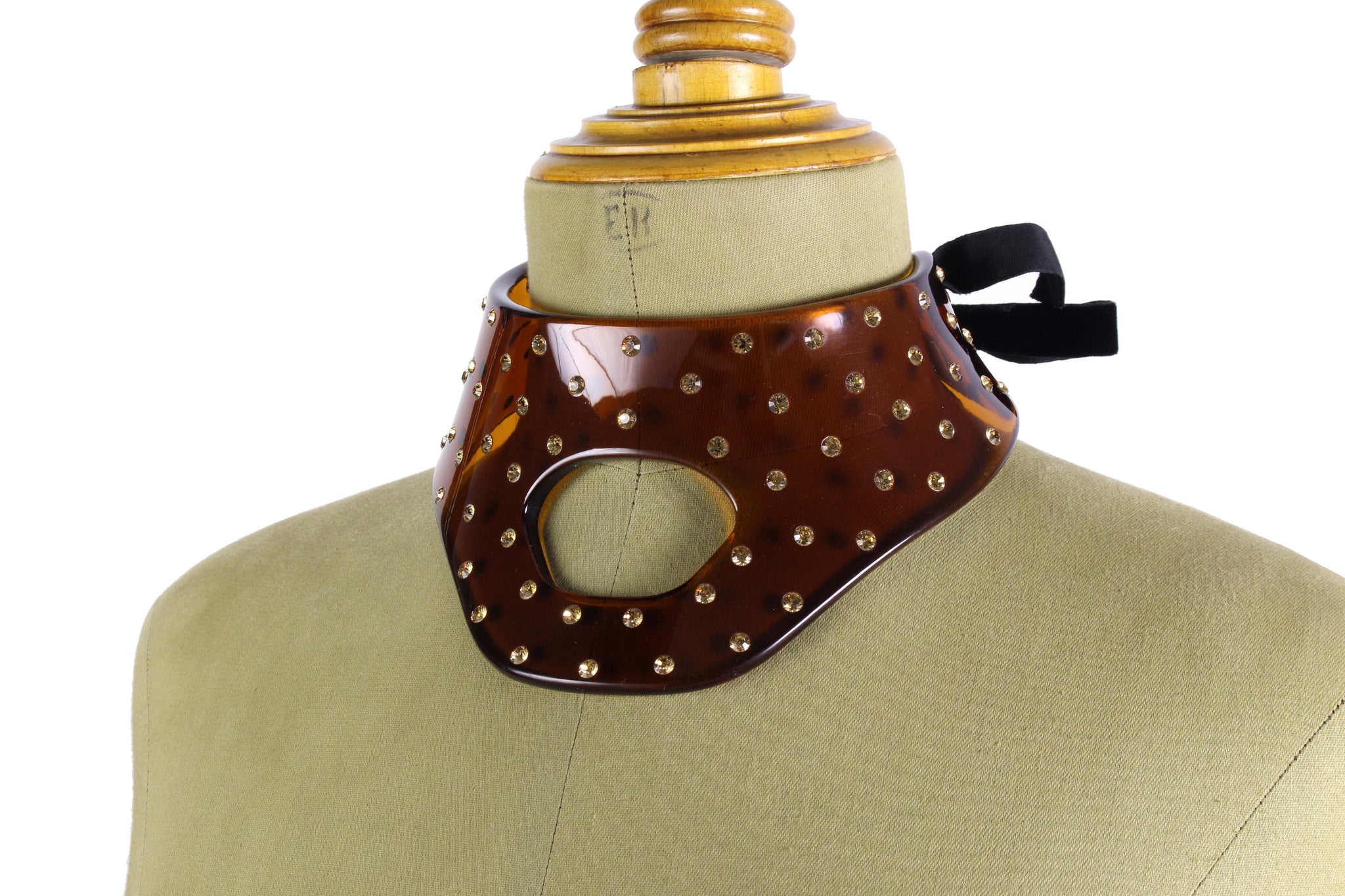 Vintage Yves Saint Laurent, made in Italy, necklace from 2003 runway Tom Ford collection for Yves Saint Laurent. Anatomically shaped necklace, brown plexiglass o methacrylate dotted with crystal diamond details with velvet ribbon tie closure. Signed on the right side. Excellent condition with superficial scratches only visible in backlight.